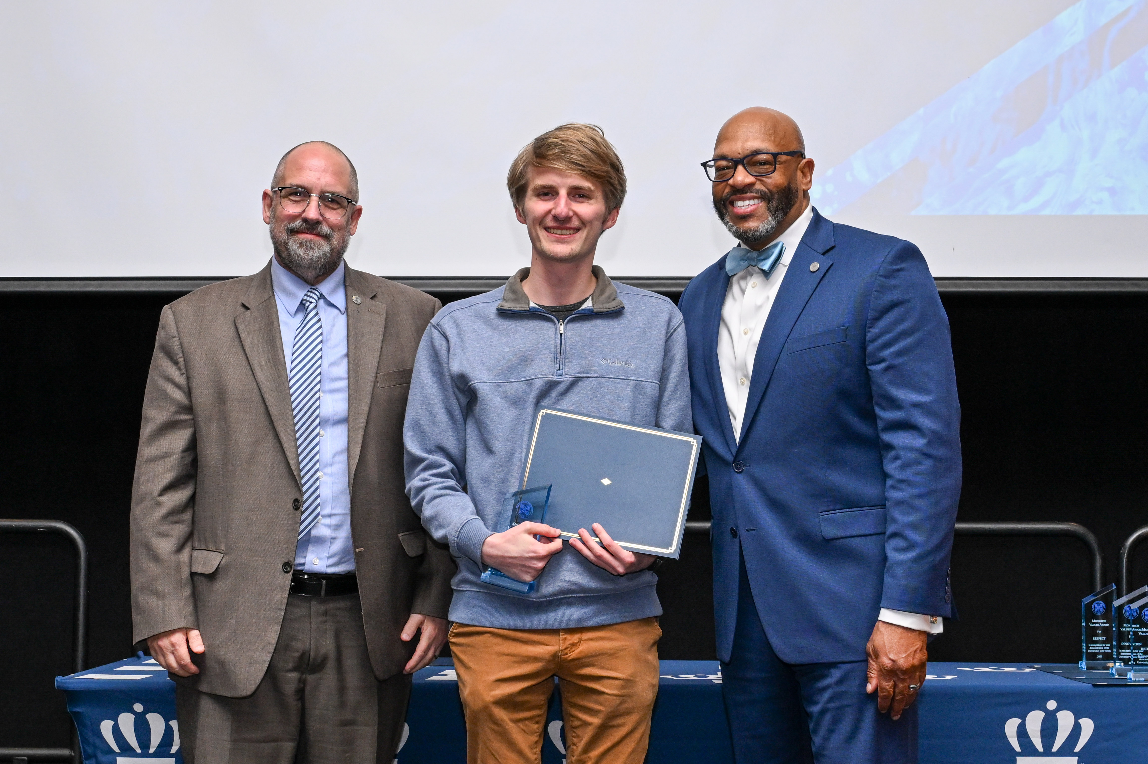 President Brian O. Hemphill and Interim Provost and Executive Vice President Brian Payne with Monarch Values Award winner Jared Sykes at the Monarch Milestones Celebration on April 10, 2025.