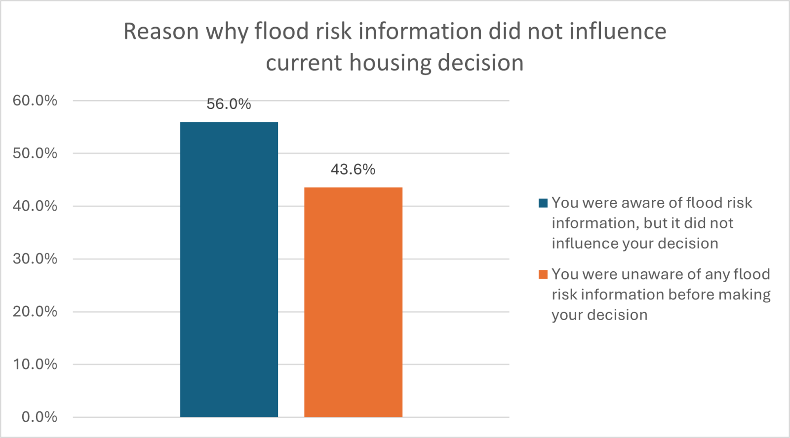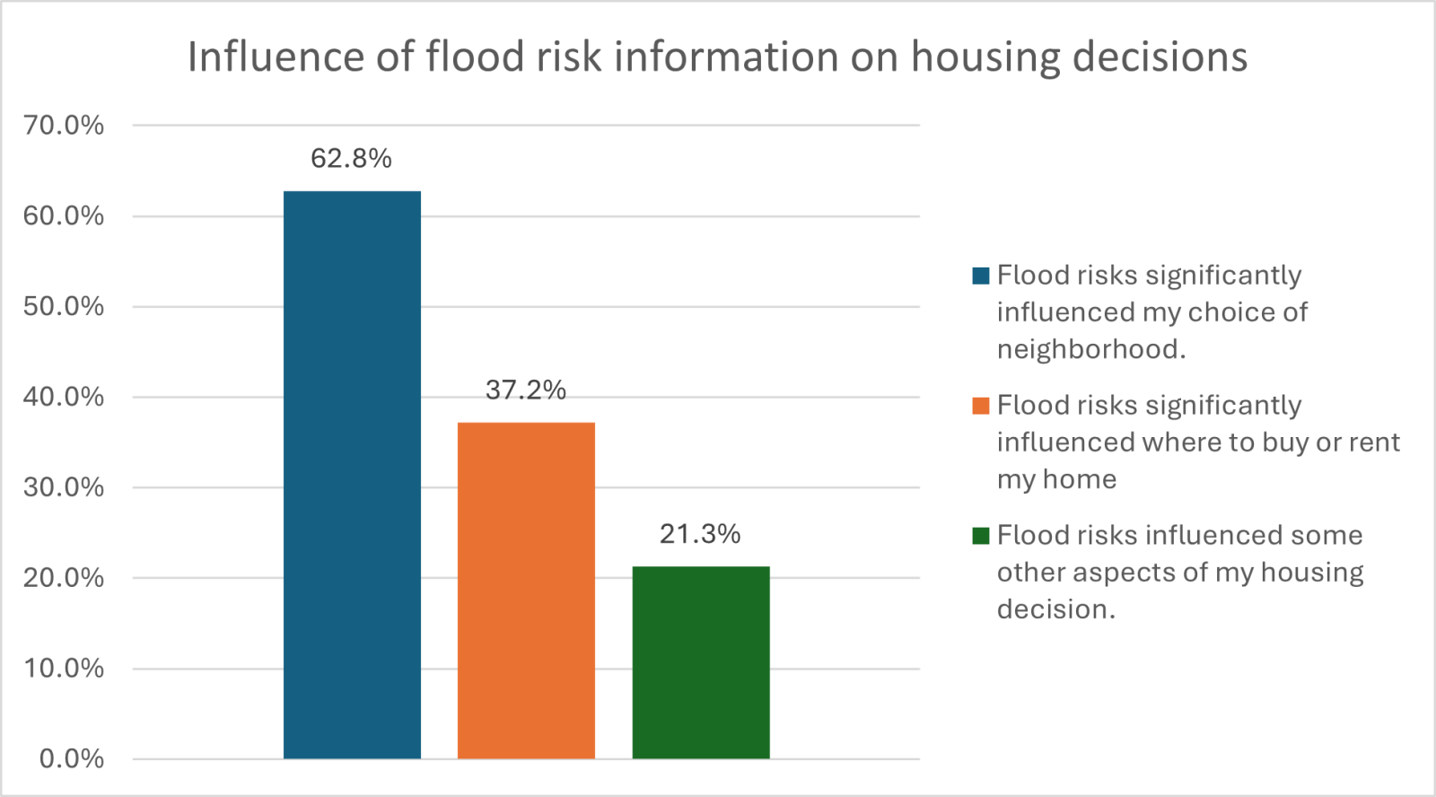 Residents were asked if flood risk information influenced their decisions about their current housing in Hampton Roads and the majority of residents (73.8%) said the flood risk information did not influence their decisions. Of the respondents who indicated they were influenced by the flood risk information, 62.8% believe flood risks significantly influenced their choice of neighborhood, 37.2% were significantly influenced whether to buy or rent their home and 21.3% reported that flood risks influenced some other aspects of their housing decision. Of those respondents who reported they were not influenced by flood risk information, 56% said they were aware of flood risk information, but that information did not influence their current housing decision and 43.6% were unaware of any flood risk information before making a decision about their current housing.
