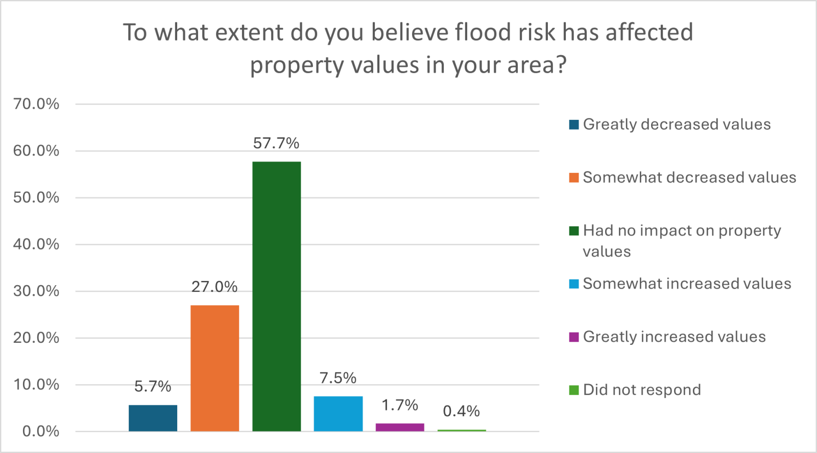 Hampton Roads residents were also asked about the effects of flood risk on property values in their area. Over half of respondents (57.7%) reported that the flood risk has had no impact on property values. More than a quarter of respondents (27%) reported a somewhat decrease in property values in their area and 5.7% reported greatly decreased values in their area.