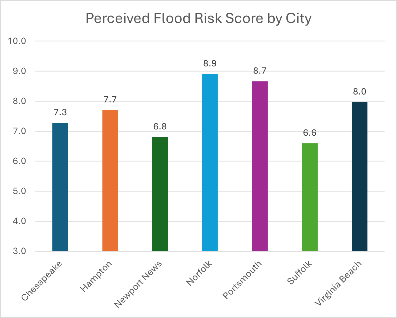 The risk of serious flooding and the resulting impacts can vary across the Hampton Roads area and the perceptions of residents regarding that risk can vary considerably as well. We computed a composite scale based on the three flooding risk items, measuring overall risk of severe flooding to one’s city, neighborhood and residents own home or property1. Overall, levels of perceived risk vary significantly across cities with Norfolk and Portsmouth residents reporting the highest level of overall risk (8.9 and 8.7), followed by Virginia Beach (8.0). Chesapeake and Hampton had midrange scores of 7.3 and 7.7, while Newport News and Suffolk residents reported a lower level of potential risk in their cities under 7.0 (6.8 and 6.6, respectively).