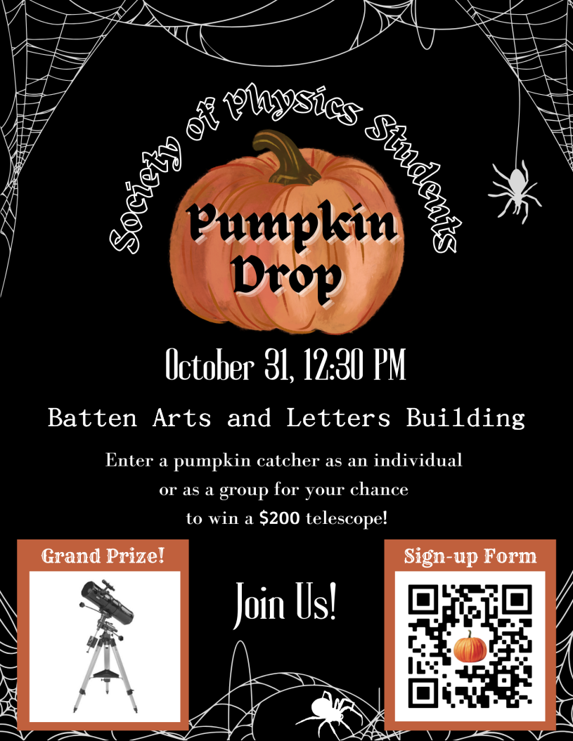 It’s time for the Society of Physics annual Pumpkin Drop! Can you build a catcher to hold a pumpkin falling from the top of one of the tallest buildings, Batten Arts Letters?