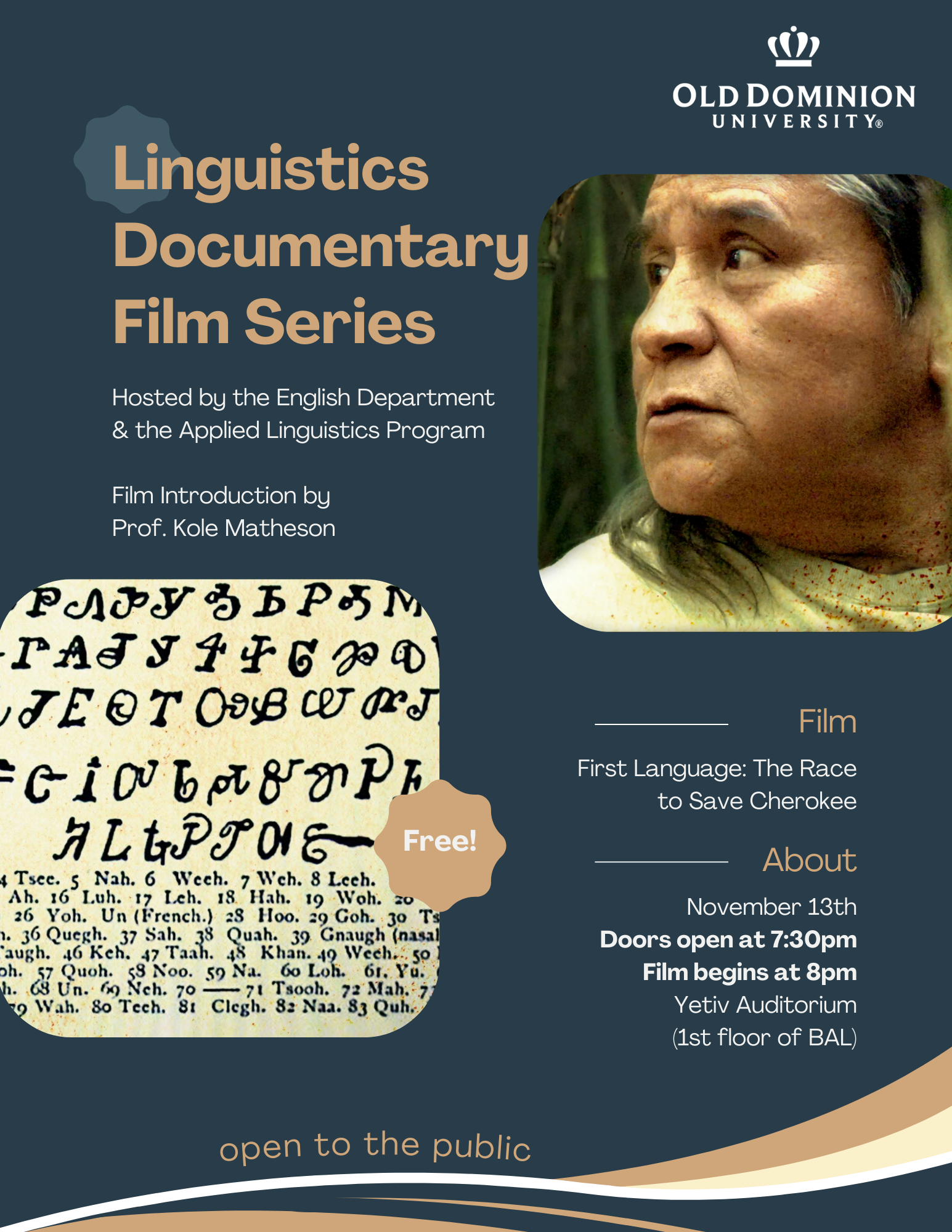 In honor of Native American Heritage Month, we will be screening the documentary film, "First Language: The Race to Save Cherokee." The 60-minute documentary follows the efforts by members of the Eastern Band of Cherokee to promote and teach their language. Film introduction by Kole Matheson, member of the Cherokee Nation.