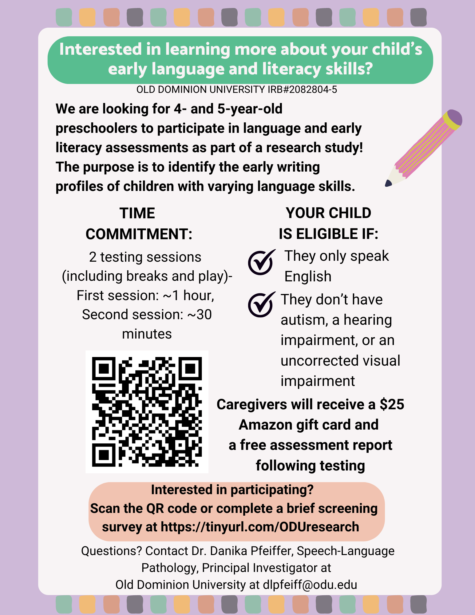 Participating families will receive a $25 Amazon gift card as well as a free, informational report of their child’s early language and literacy scores on the assessments. If interested, please complete the study screening form using this link: www.tinyurl.com/ODUresearch or reach out to Dr. Danika Pfeiffer, Principal Investigator and Assistant Professor in the School of Speech-Language Pathology, at dlpfeiff@odu.edu with any questions.