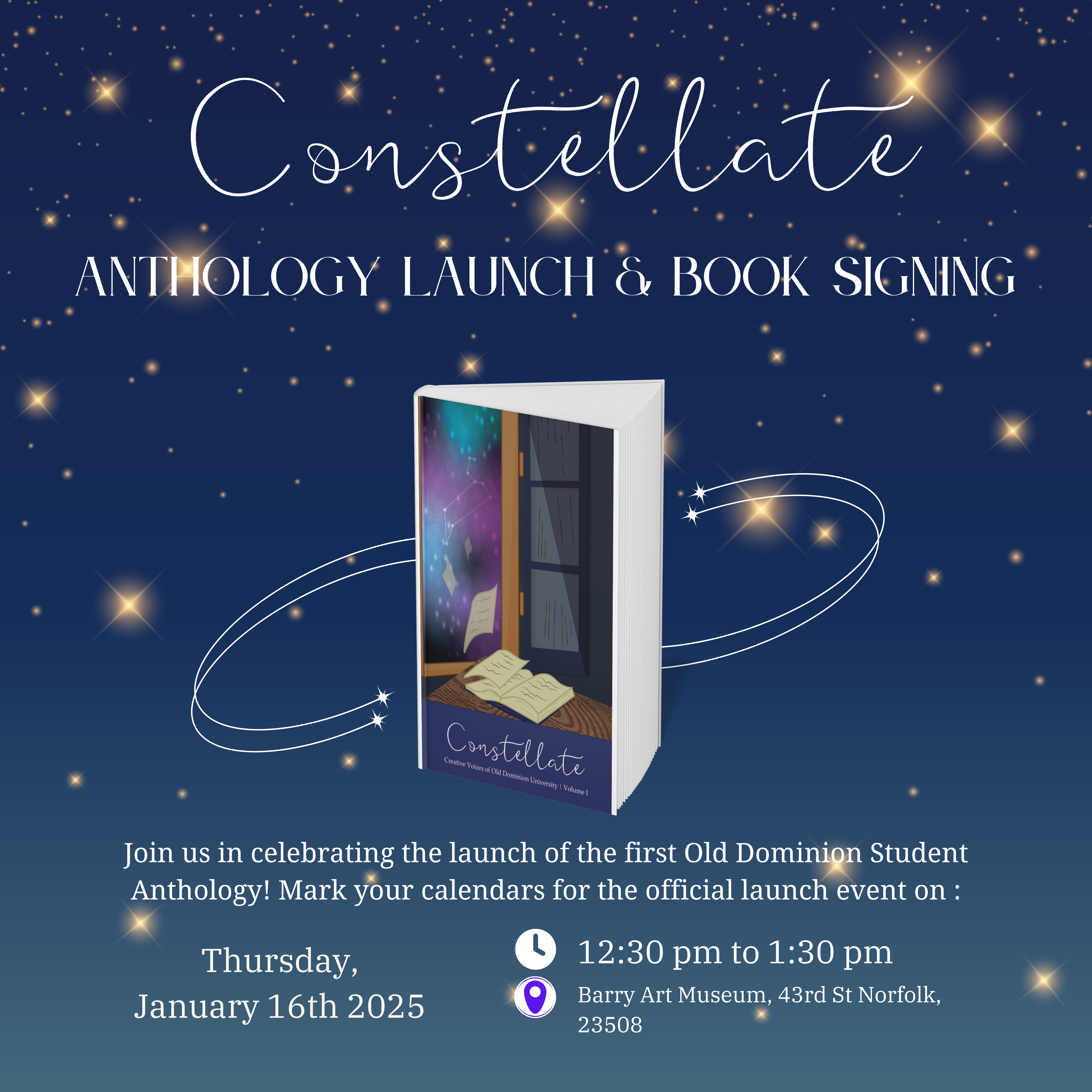 Step into the vibrant world of literary talent at our Constellate Launch Party! Join us for an unforgettable afternoon celebrating the culmination of creativity and expression as we unveil our latest collection of works penned by our very own students at Old Dominion University. We’ll have student readings and book signing to mark the first student anthology publication put together by the MFA Creative Writing Department.