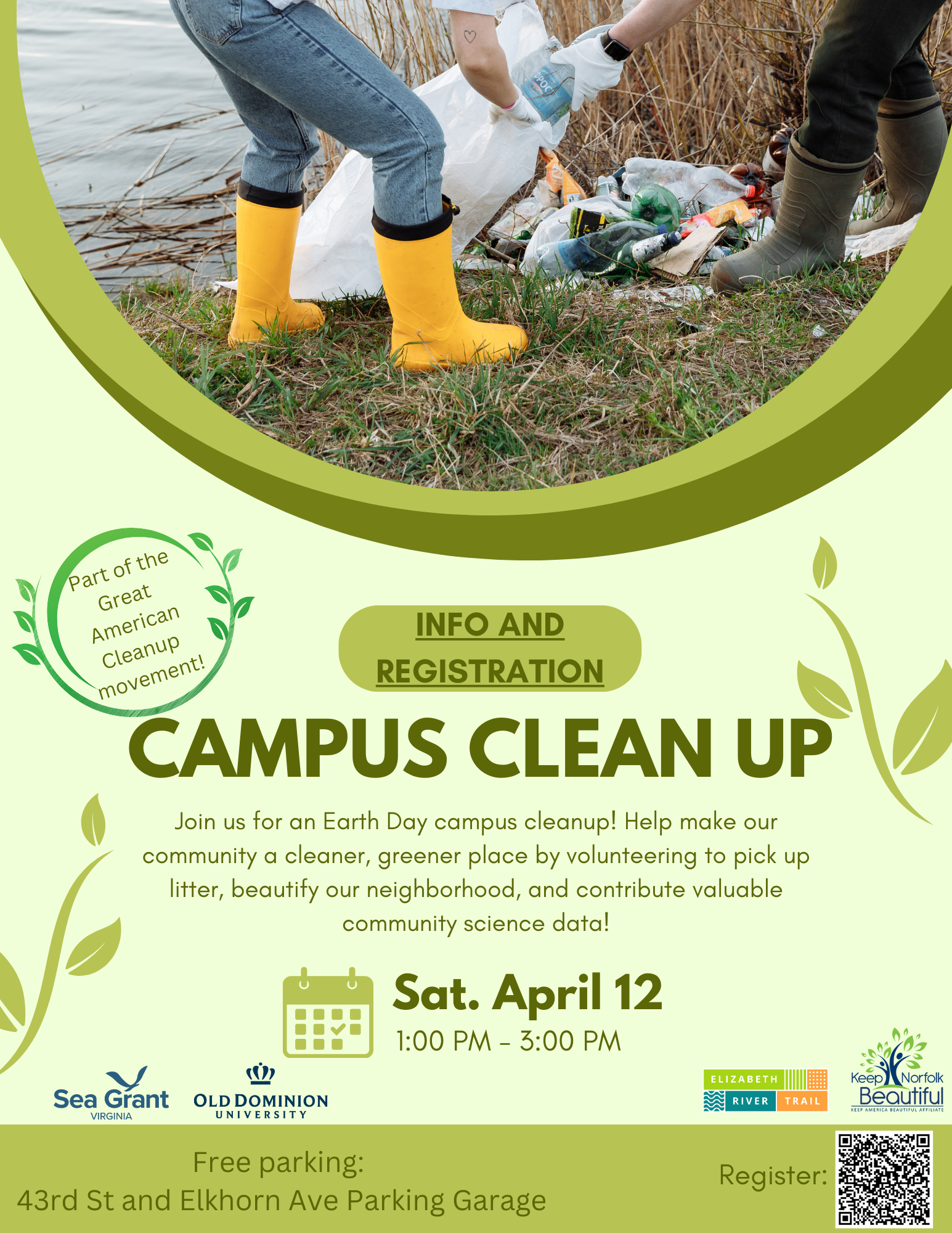 Be part of the Great American Cleanup movement and engage in community science by volunteering for a campus cleanup on Saturday, April 12, 1:00 - 3:00pm! Join ODU's Center for Coastal Physical Oceanography, Keep Norfolk Beautiful, and the Elizabeth River Trail as we pick up and record trash along the Kaufman Mall and from the ponds at Brock Commons. All cleanup supplies and data collection will be provided. Register here! Interested in other Earth Day activities with the College of Sciences? View the events happening that morning!