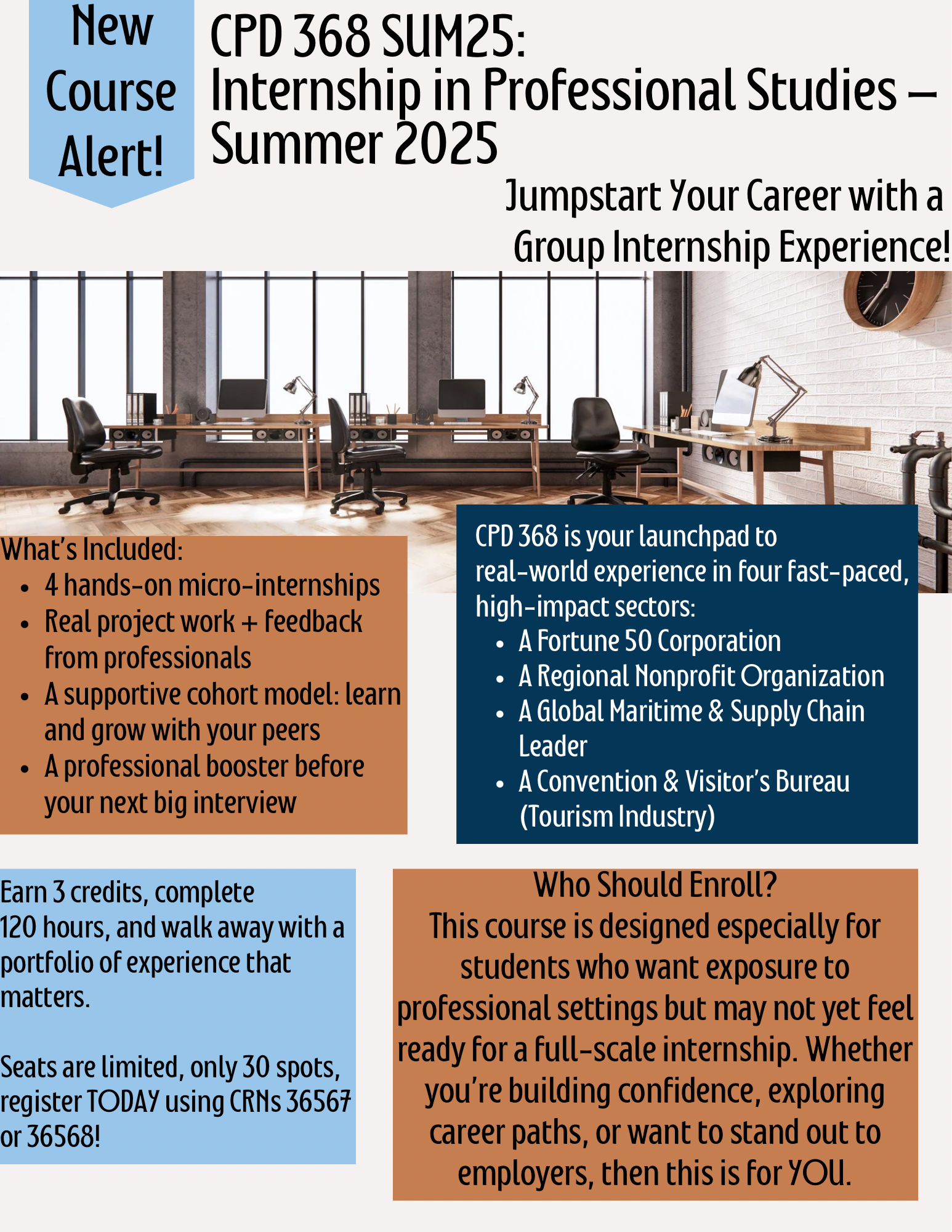 Ready to build your skills, expand your connections, and earn academic credit — all in one dynamic experience?