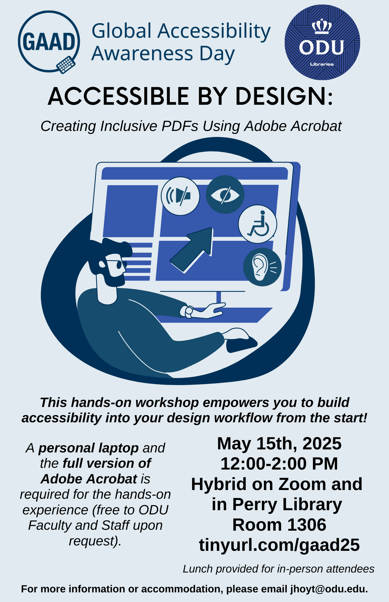 Join ODU Libraries + Employees with Disabilities Association for a hands-on training session where ODU employees and students will learn how to create accessible PDFs using W3C accessibility standards. Whether you're designing course materials, office documents, or digital flyers, this session will guide you through the steps to ensure your PDFs are usable by everyone—including individuals using assistive technology.