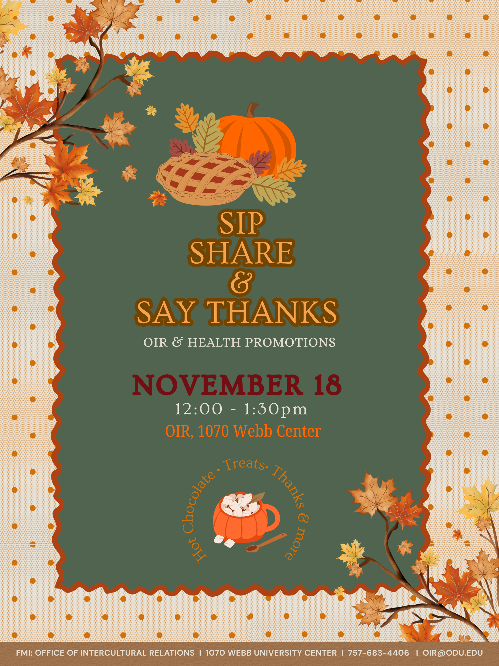 Celebrate gratitude from around the world with OIR! Enjoy a warm cup of hot chocolate and cookies, and take a moment to write what you’re thankful for in your language. Connect with others, share stories, and celebrate how thankfulness is expressed across cultures.