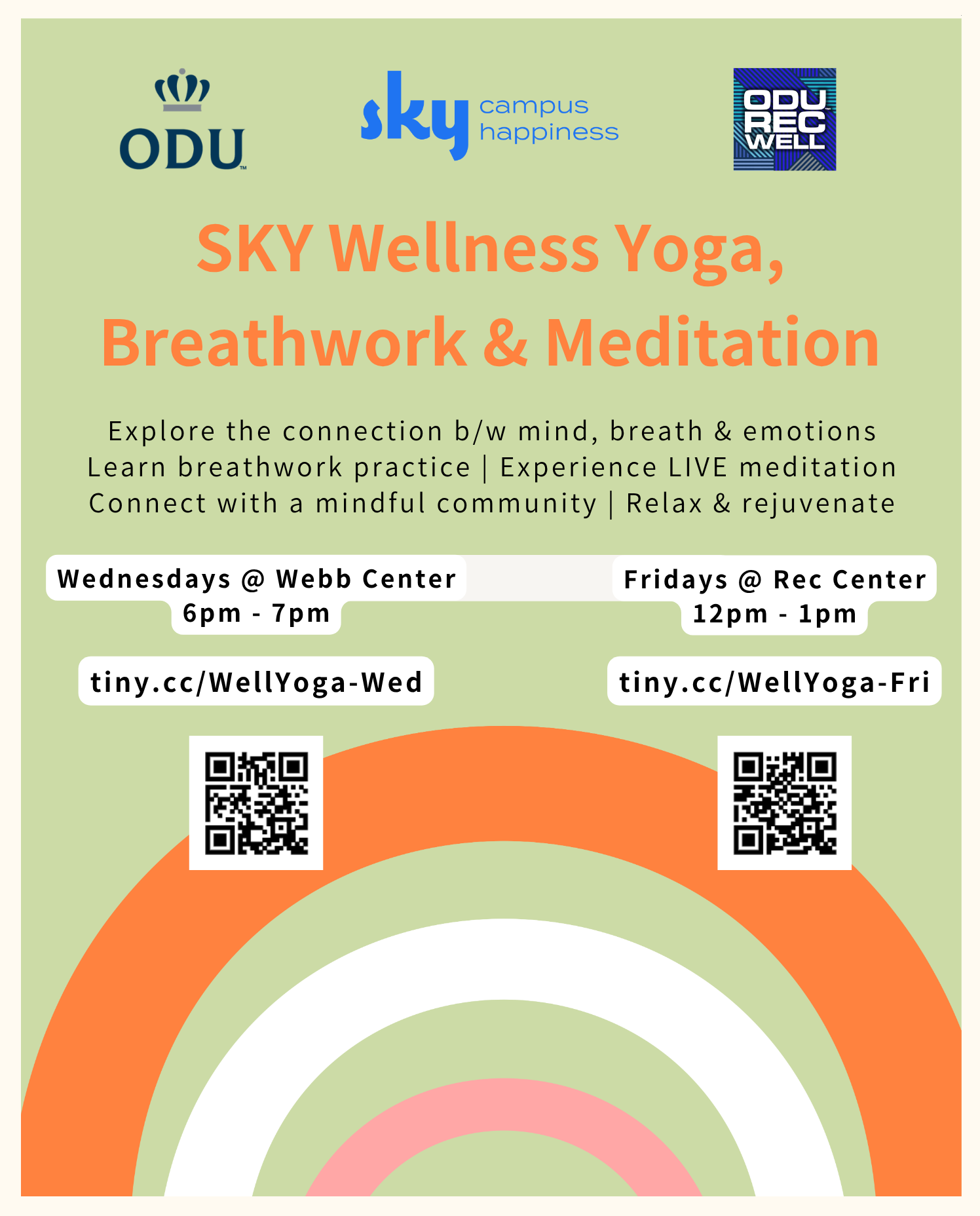 Come experience "Wellness Yoga, Breathwork & Meditation", interact with a certified Wellness Coach, connect with like-minded others, and find tools for instant calm & rejuvenation. Guided by an expert Wellness Coach & Yoga/Meditation Trainer, you will dive into the skill/art of using yoga to strengthen your body, breathwork & meditation to master the mind. You will also have a chance to ask questions & hear a little of the research on meditation, and experience how community makes the practices even more powerful. The SKY Campus Happiness team is hosting two sessions a week on ODU campus. It's Open to ALL and FREE to attend.