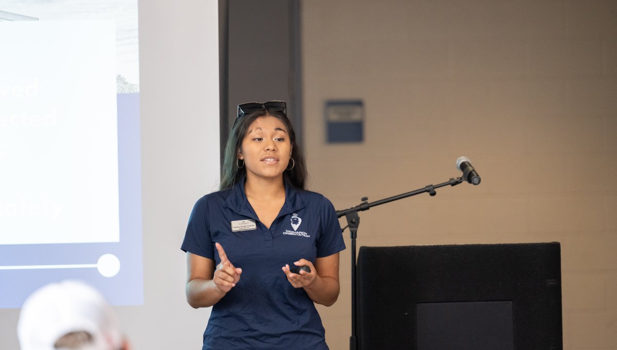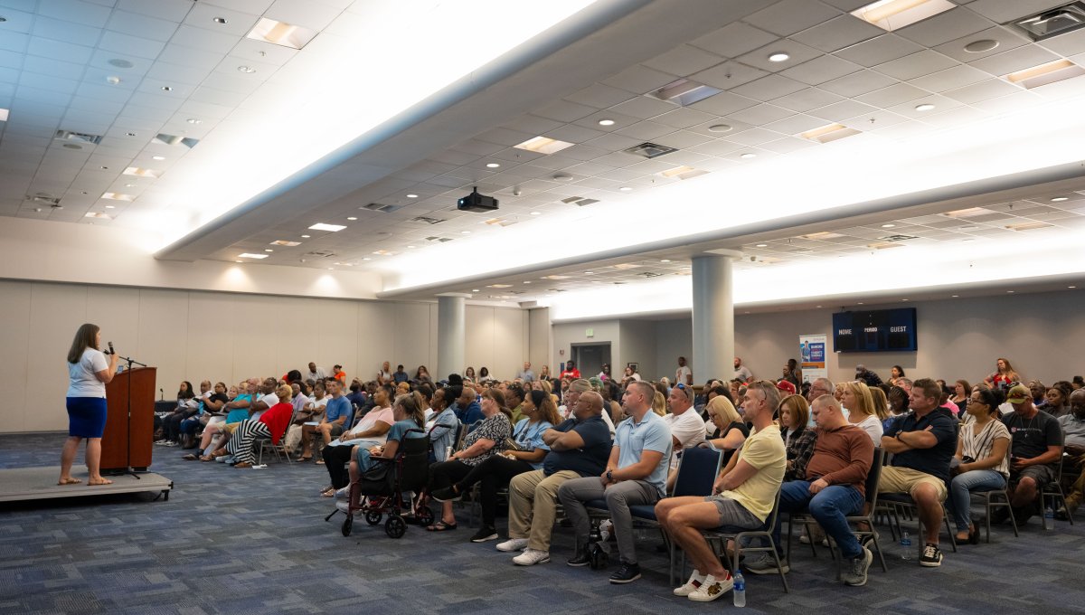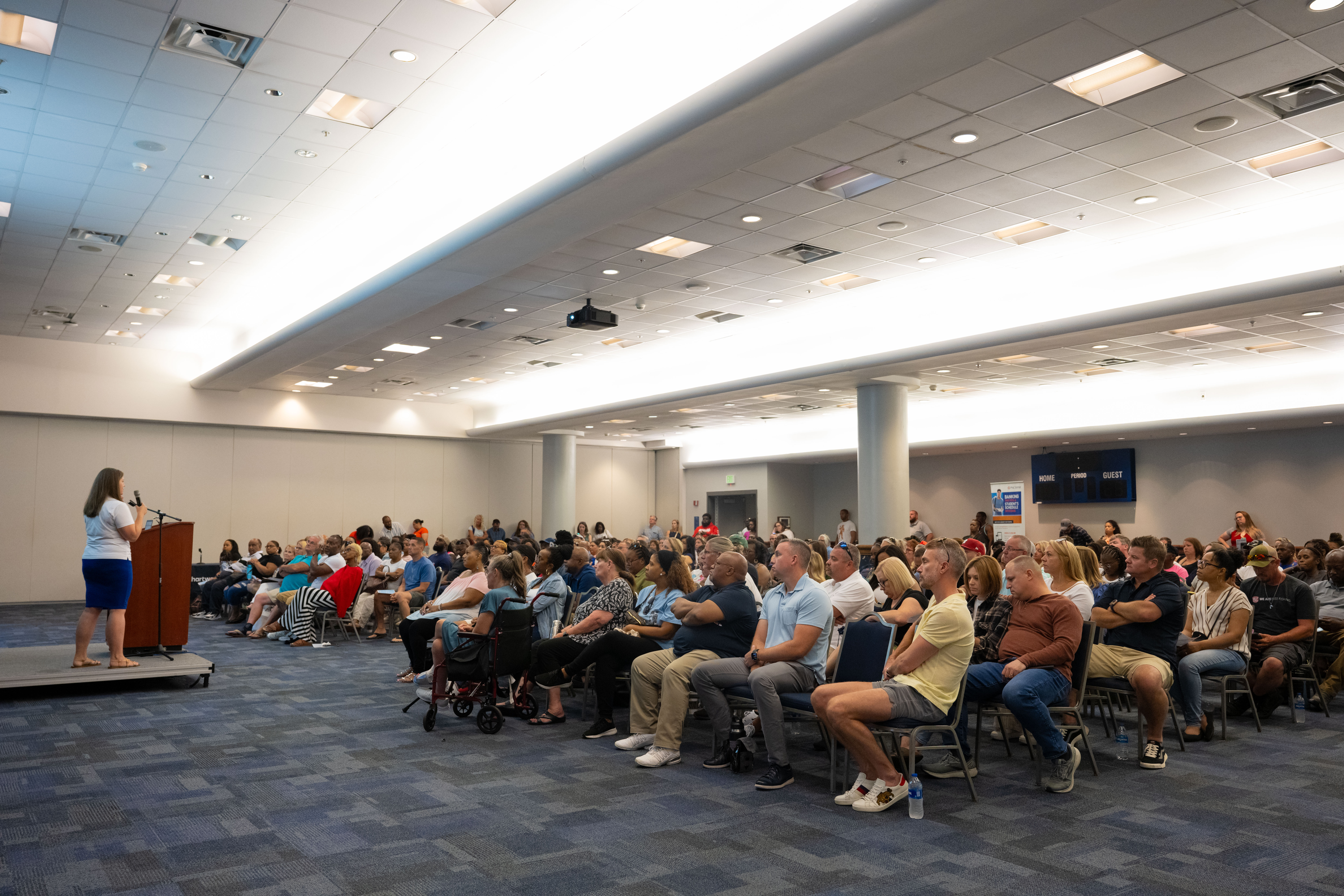 Katie Winstead Reichner, executive director of student engagement and traditions, tells parents what their children can expect as they start the college careers at ODU. Photo Nicholas Clark/ODU