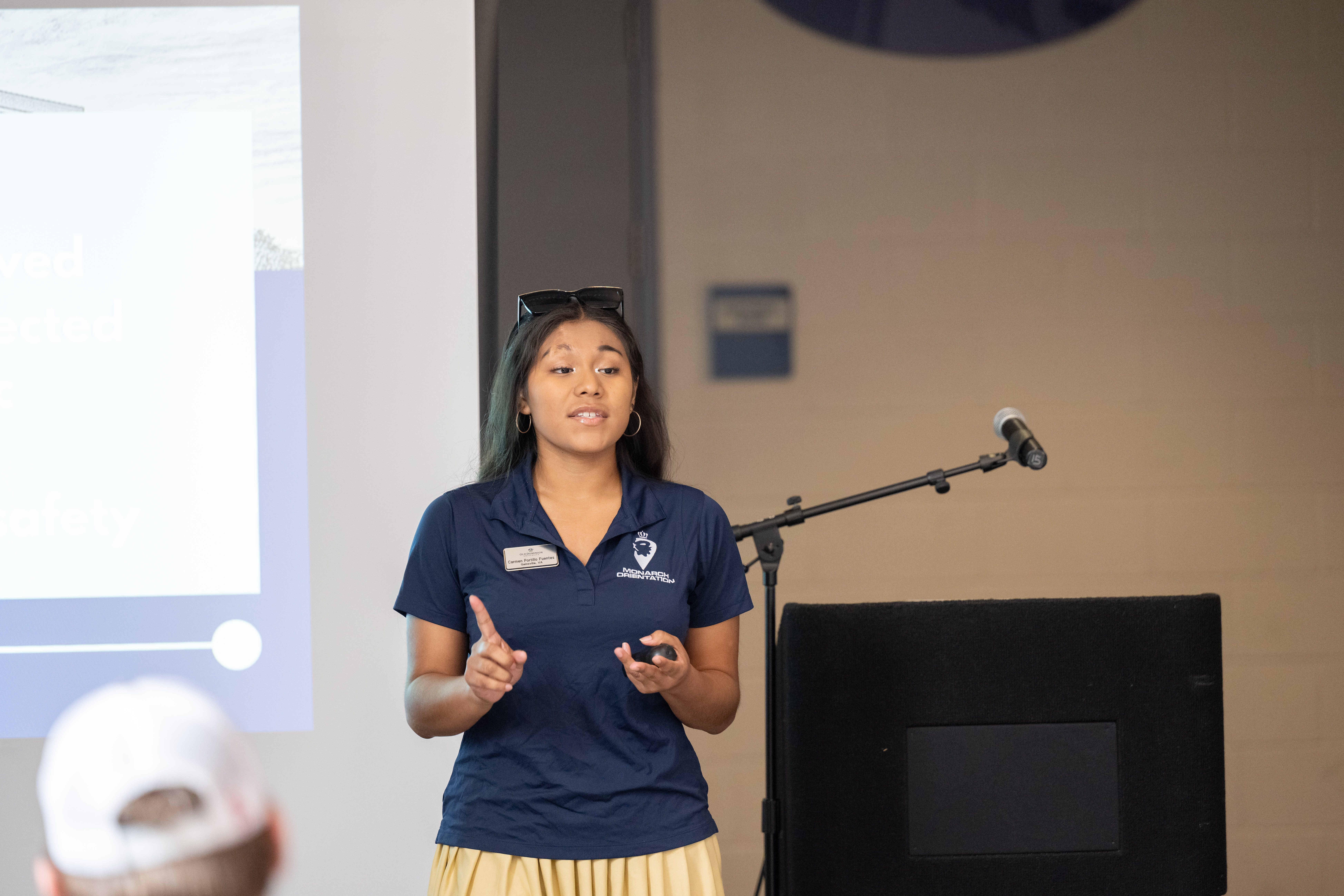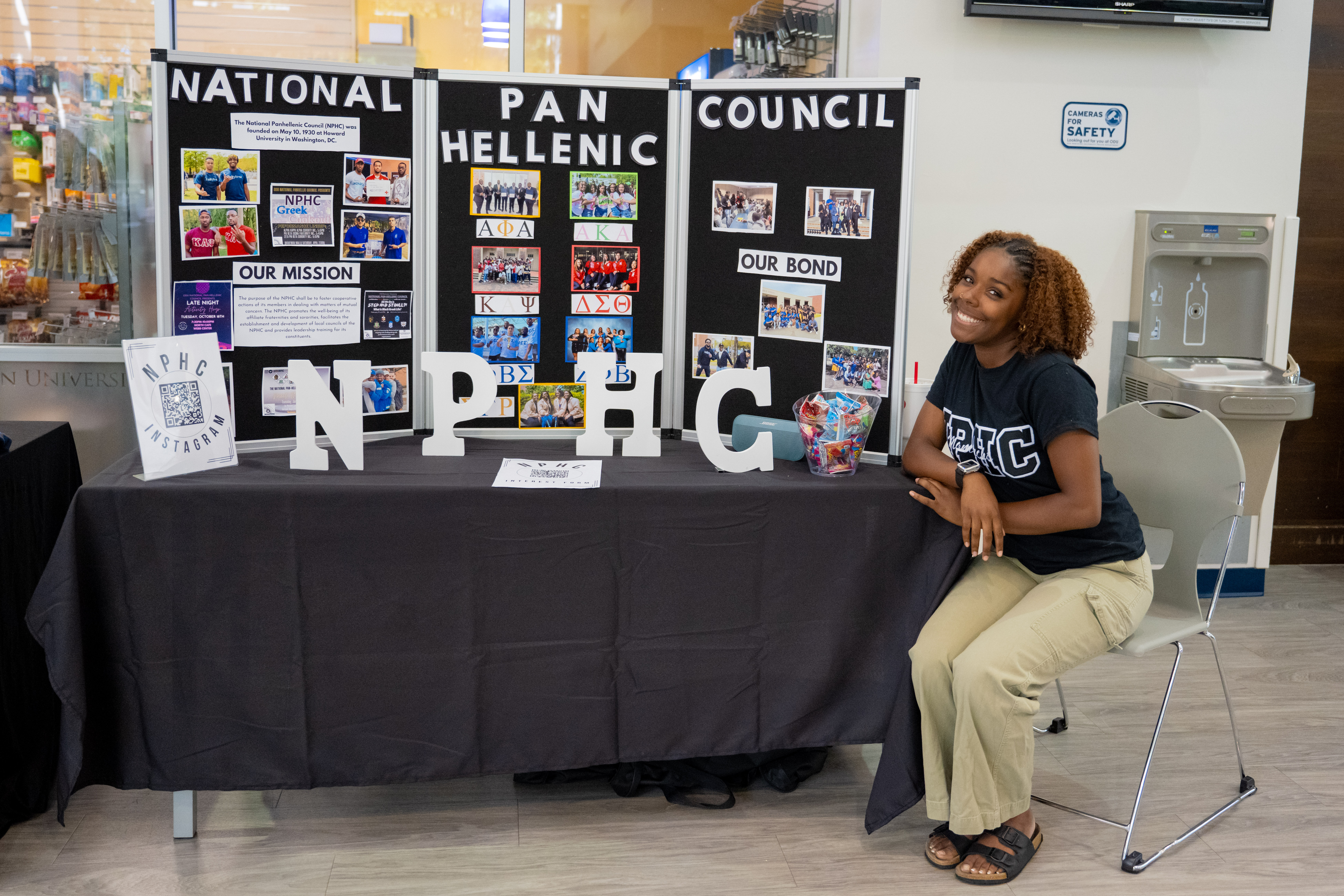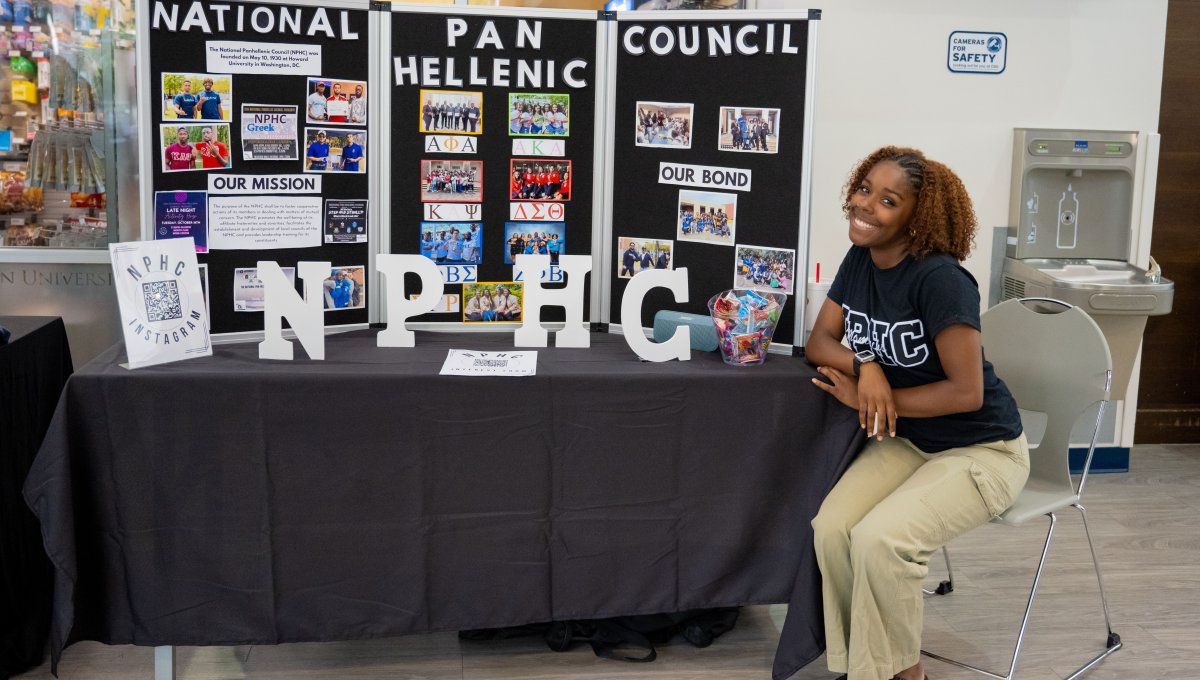 Taneya Jones is on hand to talk to incoming freshmen about the National Pan Hellenic Council and how they can get involved with fraternity and sorority life. Photo Nicholas Clark/ODU