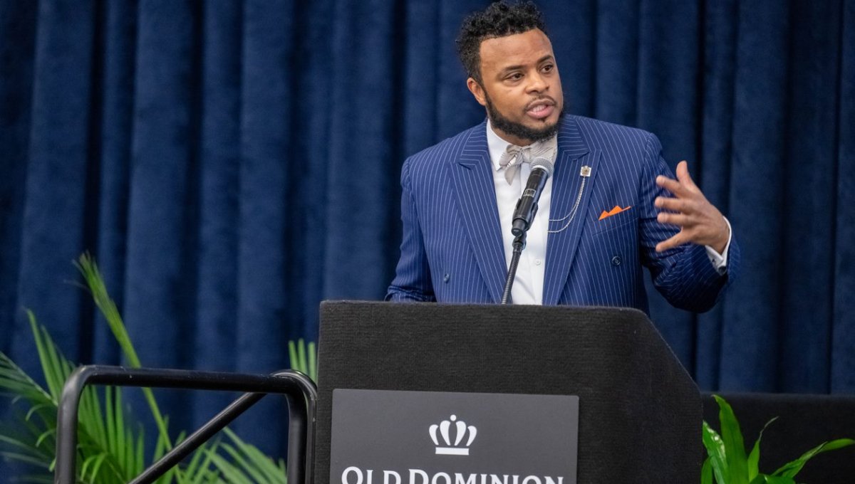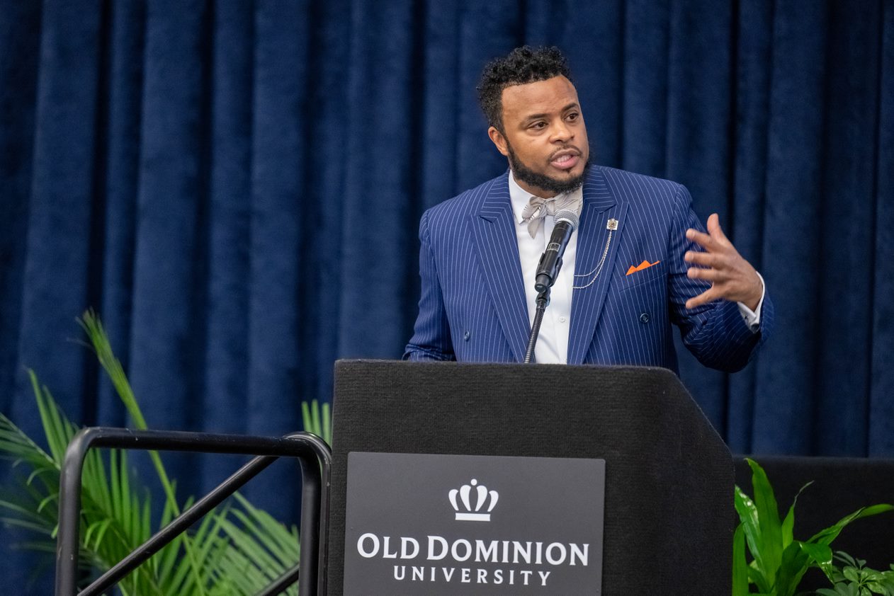 Antipas Harris, founder, president and dean of the Urban Renewal Center in Norfolk, delivers the keynote address. Chuck Thomas/ODU