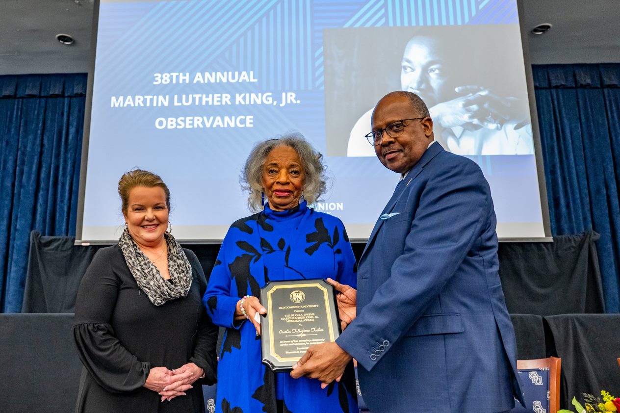 The Hugo Owens Martin Luther King, Jr. Memorial Award is given annually to an individual or organization that has made considerable contributions to civil rights, politics, housing and social programs through leadership, dedication and persistence. The 2023 recipient is Cecelia “Cee Cee" Tucker, assistant to the president emerita for community relations. Karen Meier (left), ODU’s associate VP for strategic operations, and Hugo A. Owens Jr., son of the late Hugo Owens Sr., present the award. Photo Chuck Thomas/ODU