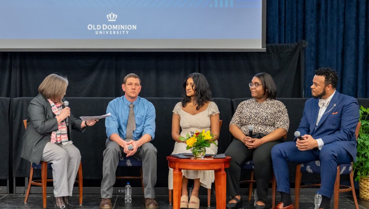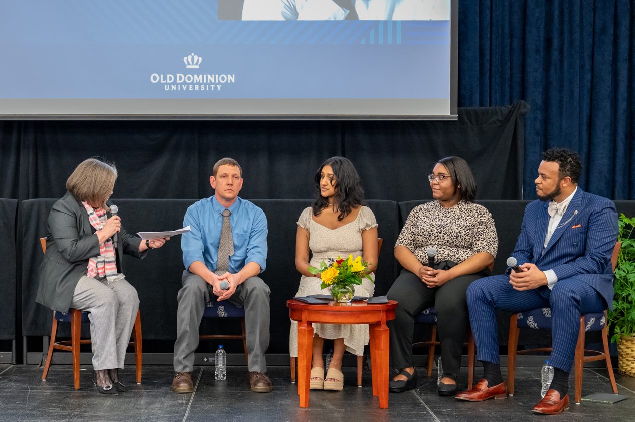 Cathy Lewis (left) moderates a panel discussion featuring Elijah Webb, Priya Prabhukumar, Destini Harrell and Antipas L. Harris. Photo Chuck Thomas/ODU