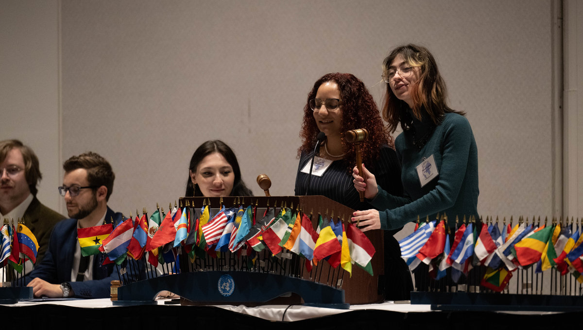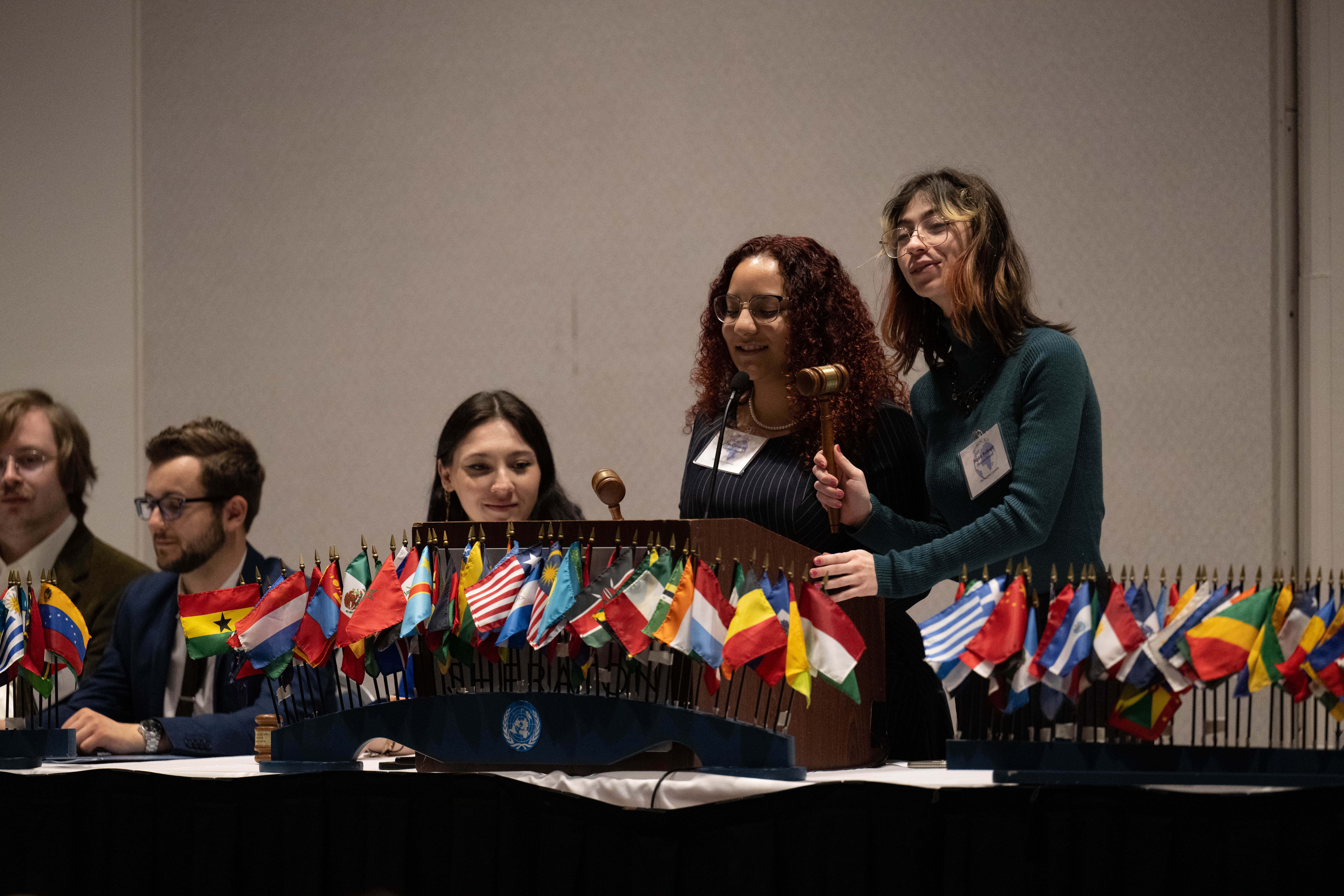 Secretary General Ana Camacho, left, and Director General Sophie Rofheart bang their gavels, signifying the start of the 46th ODU Model United Nations Conference. Photo Chuck Thomas/ODU