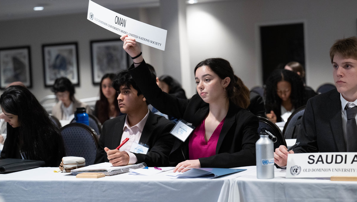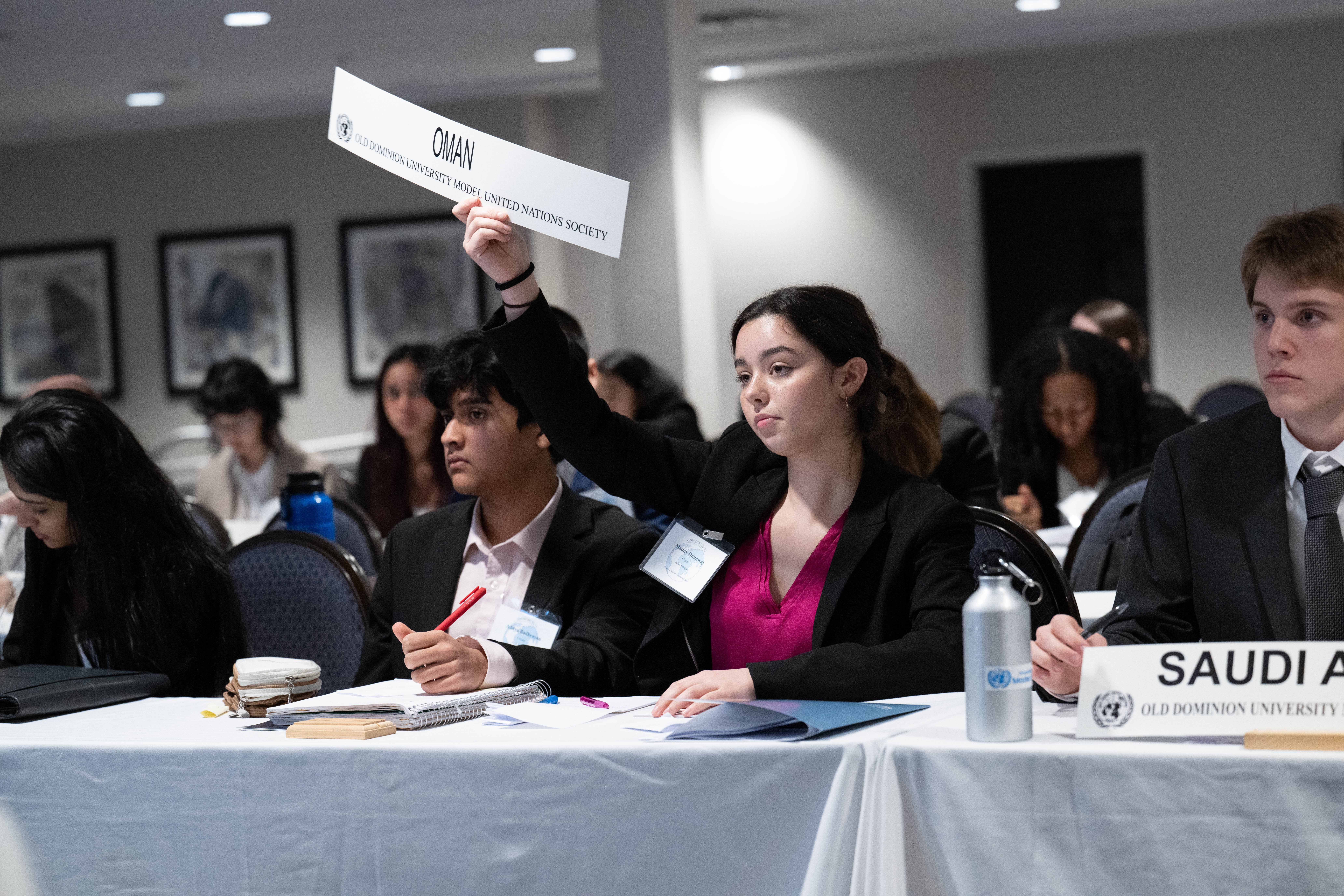 Delegate Maddy Dunaway raises her placard during a vote to set speaker time limits in the Arab League committee meeting. Photo Chuck Thomas/ODU