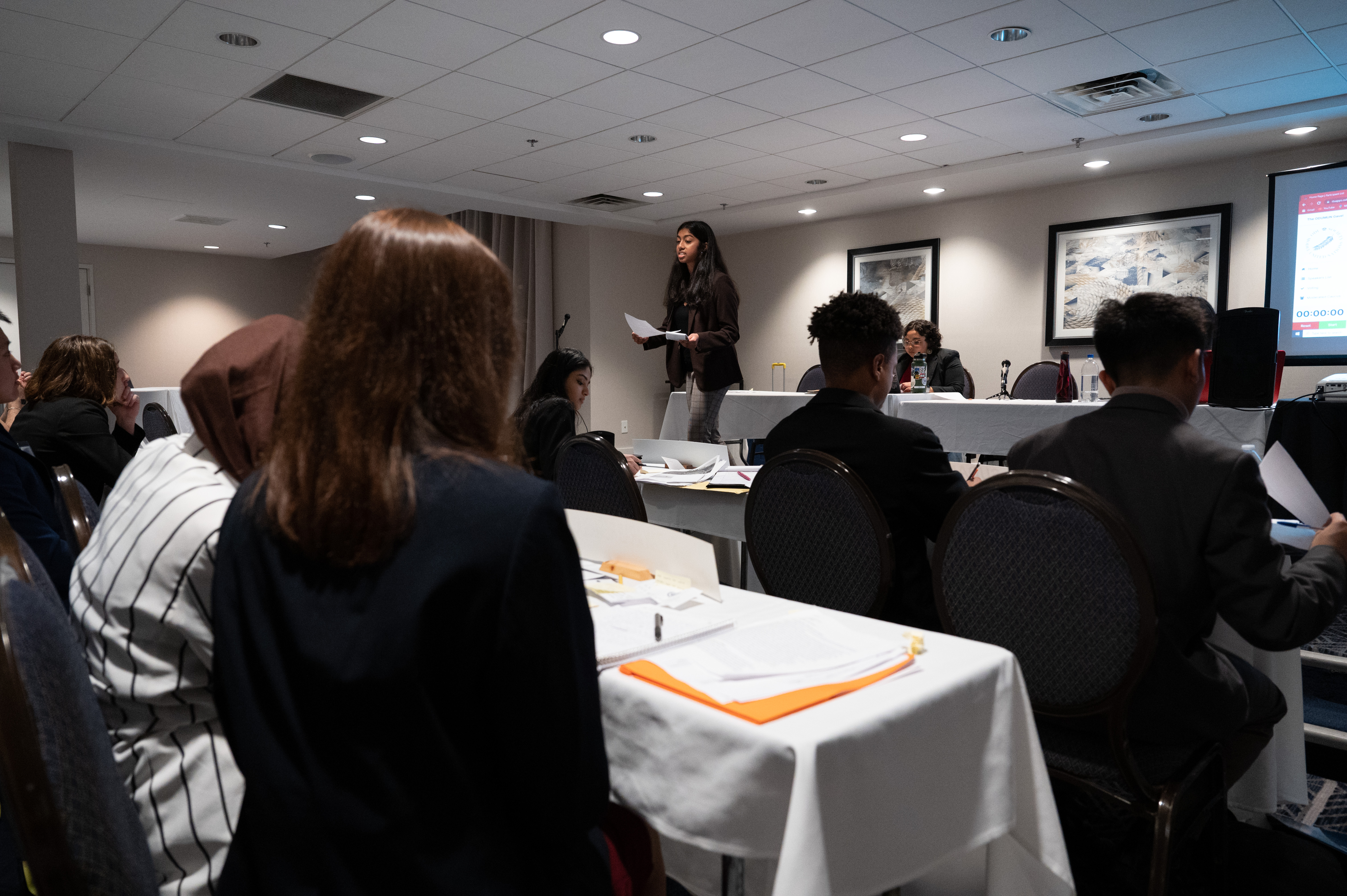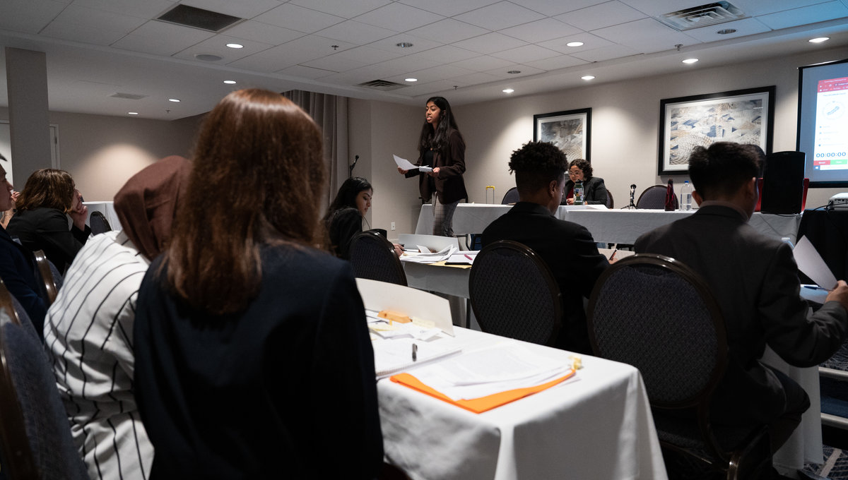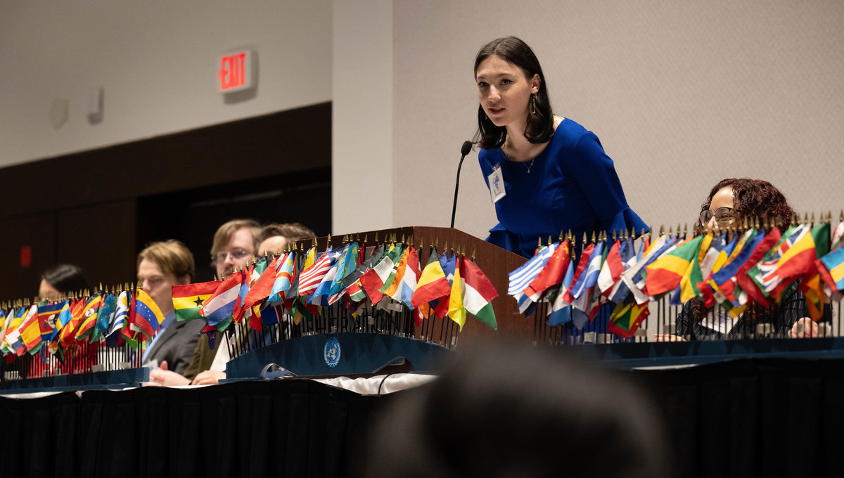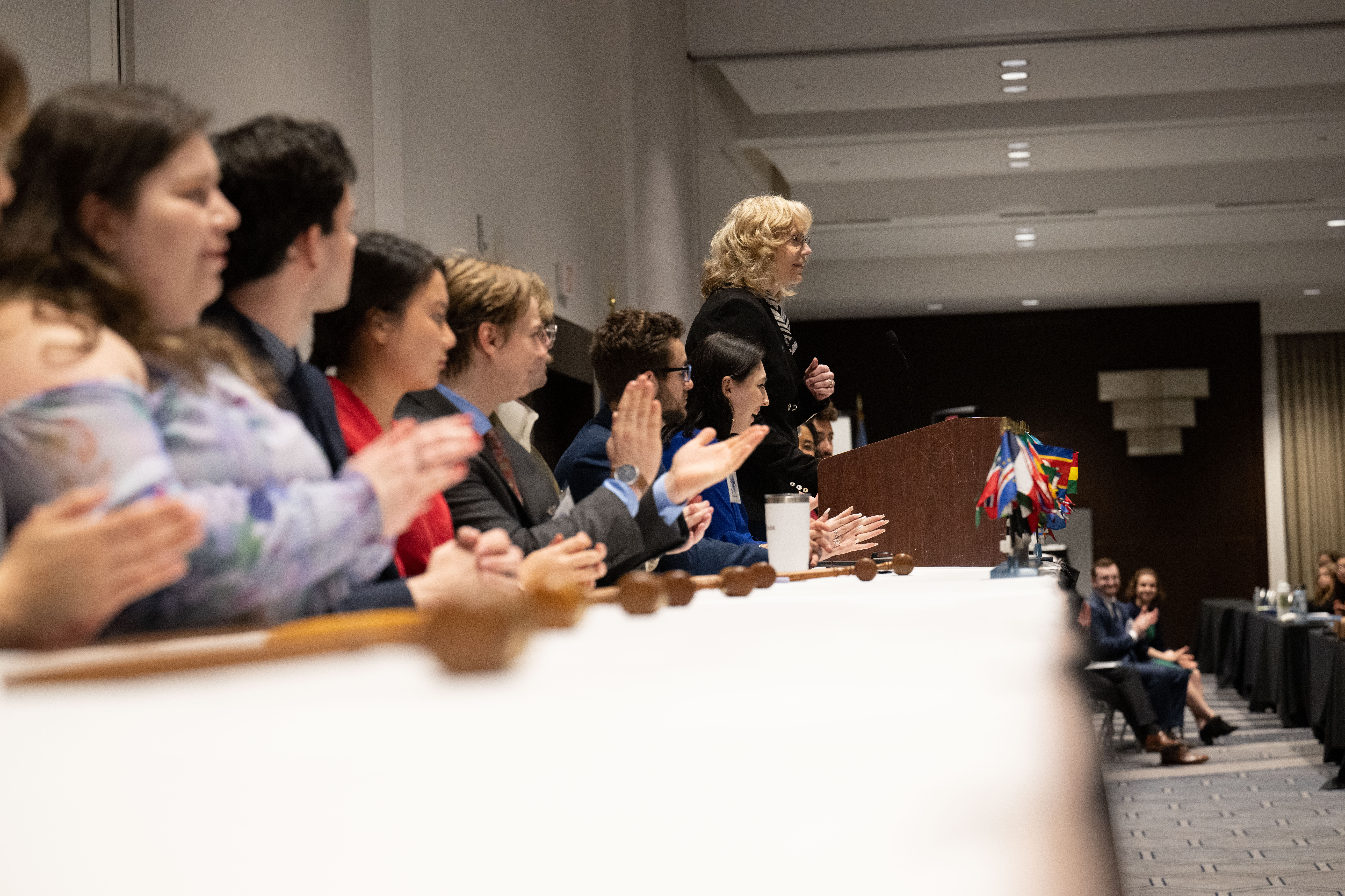 Delegates have one minute to present their case to representatives of other countries. Photo Chuck Thomas/ODU