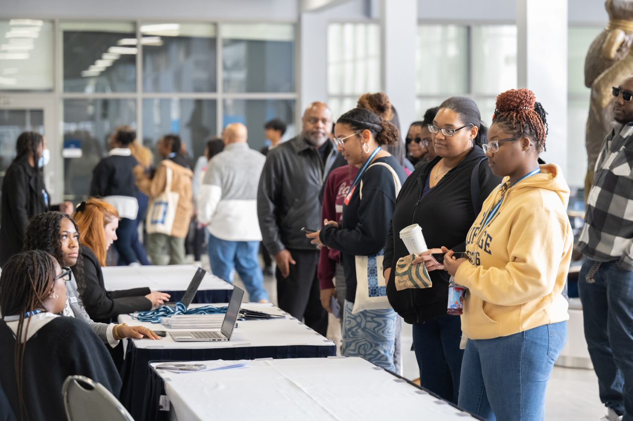 Families check in for Scholars Day at Webb Center with help from ODU students. Photo Nicholas Clark/ODU