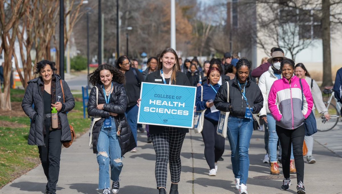 Campus ambassadors lead future students and their family members to the College of Health Sciences. Photo Nicholas Clark/ODU