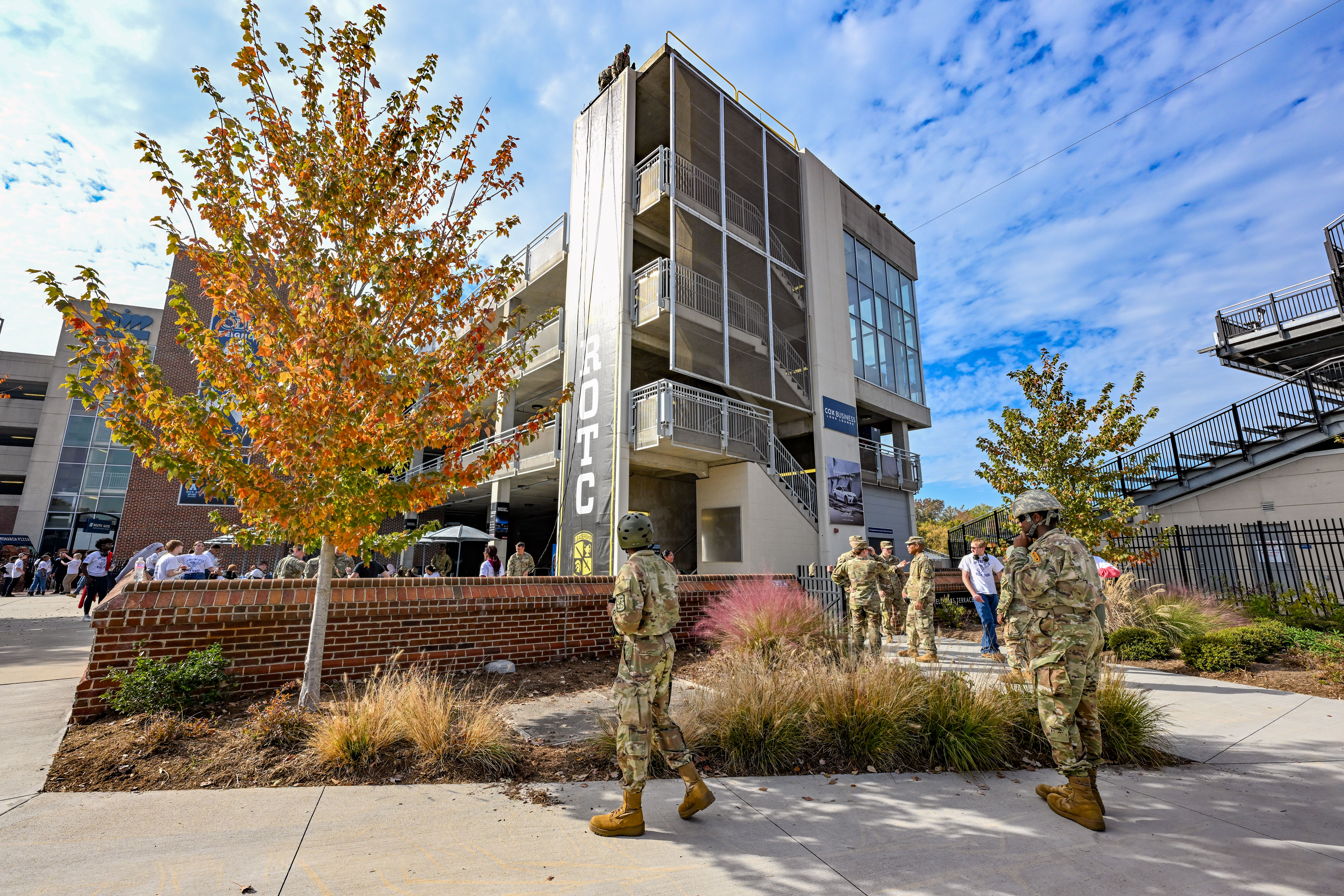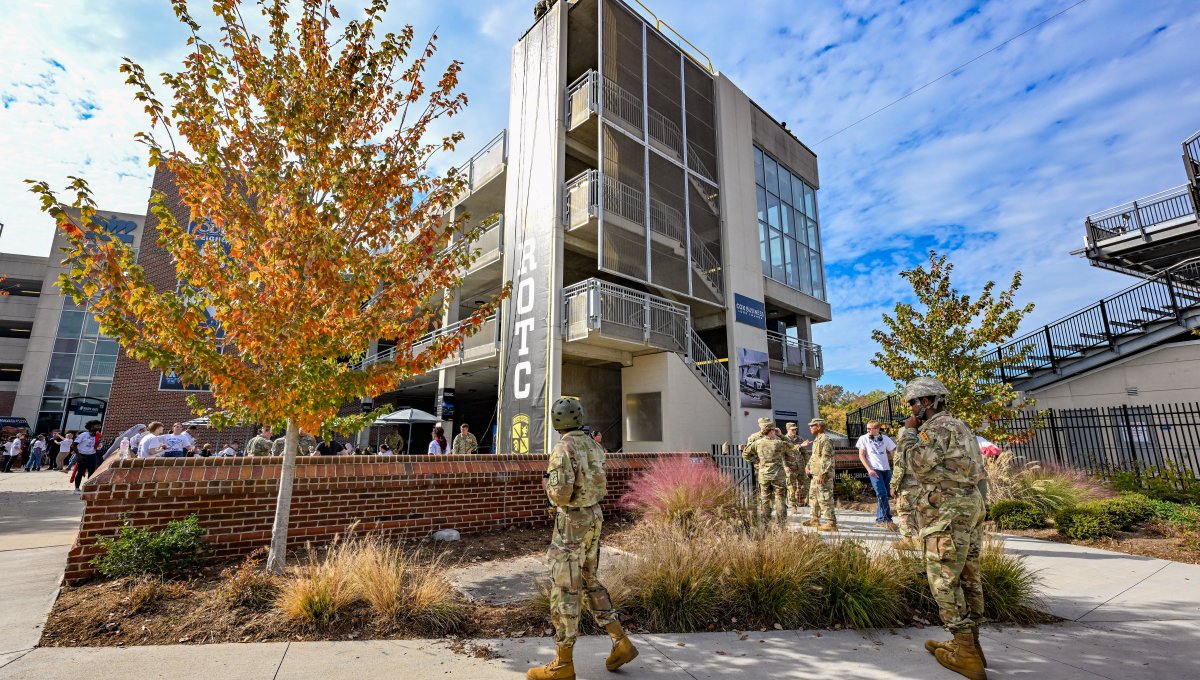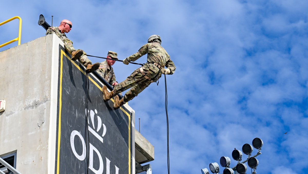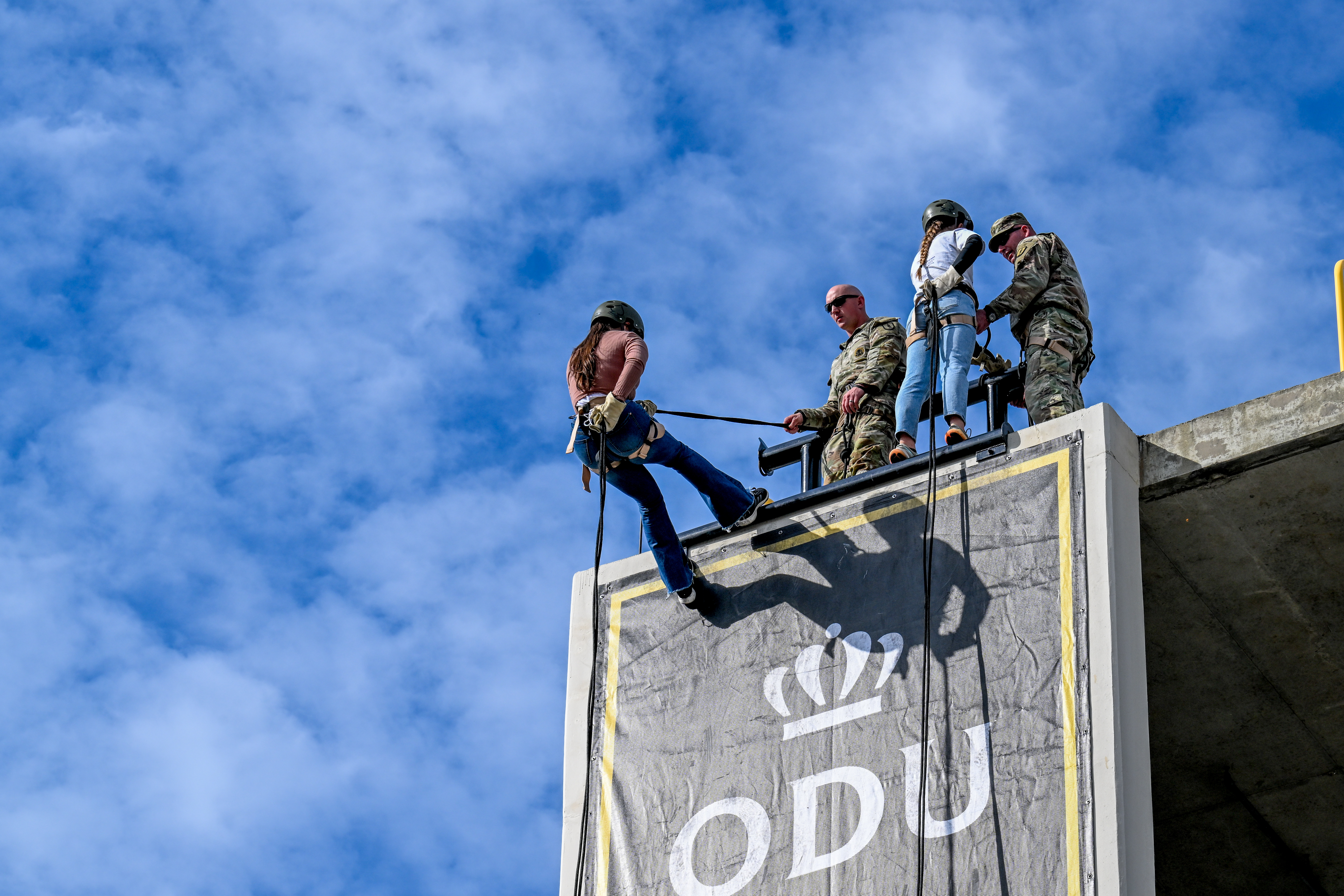The Ainslie Game Day Building serves as an ideal setting for students and student cadets to practice rappelling. Photo chuck Thomas/ODU