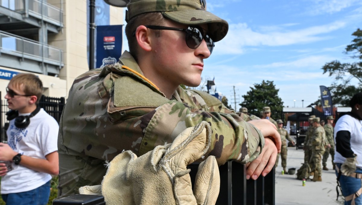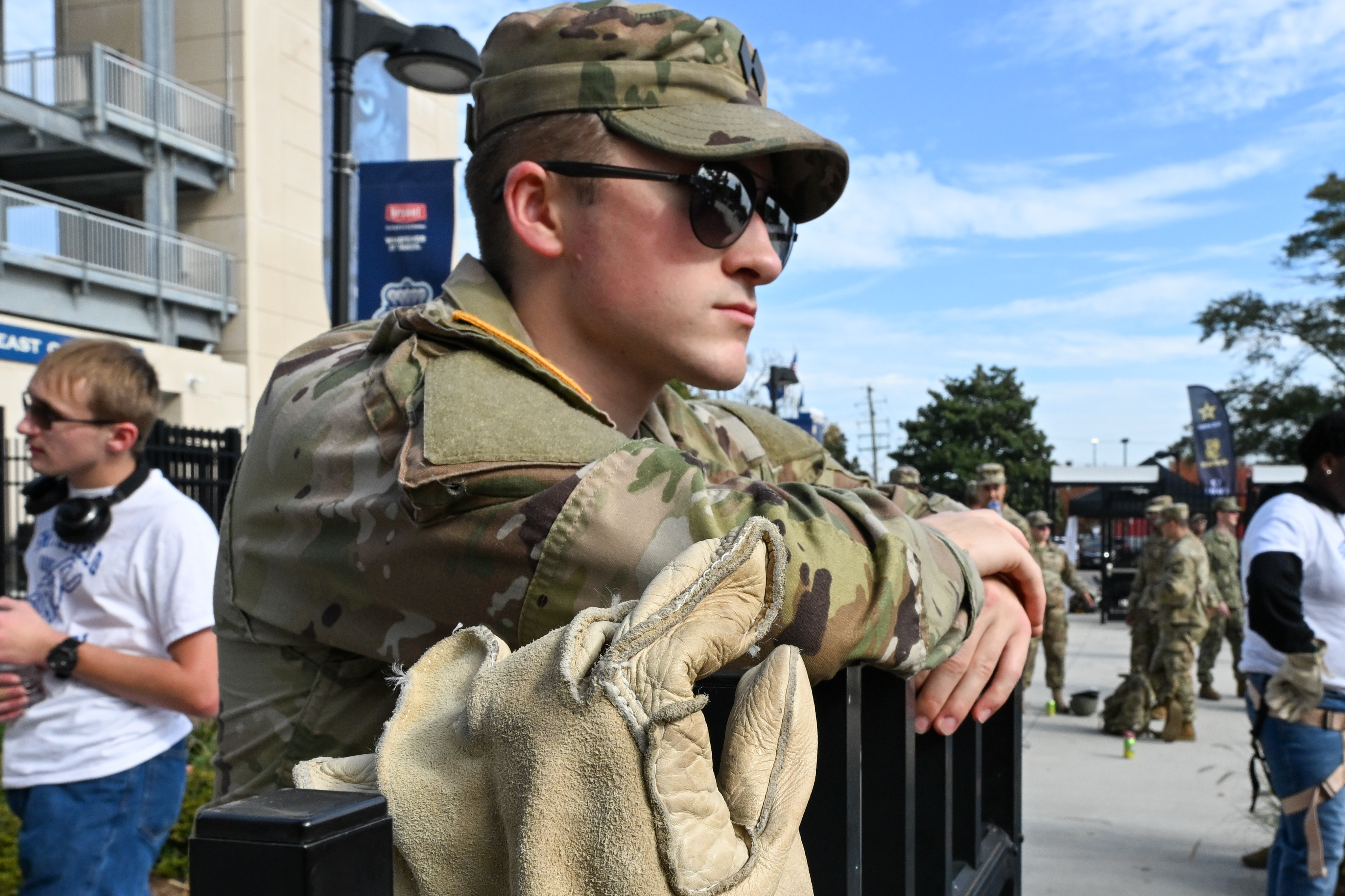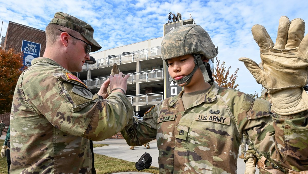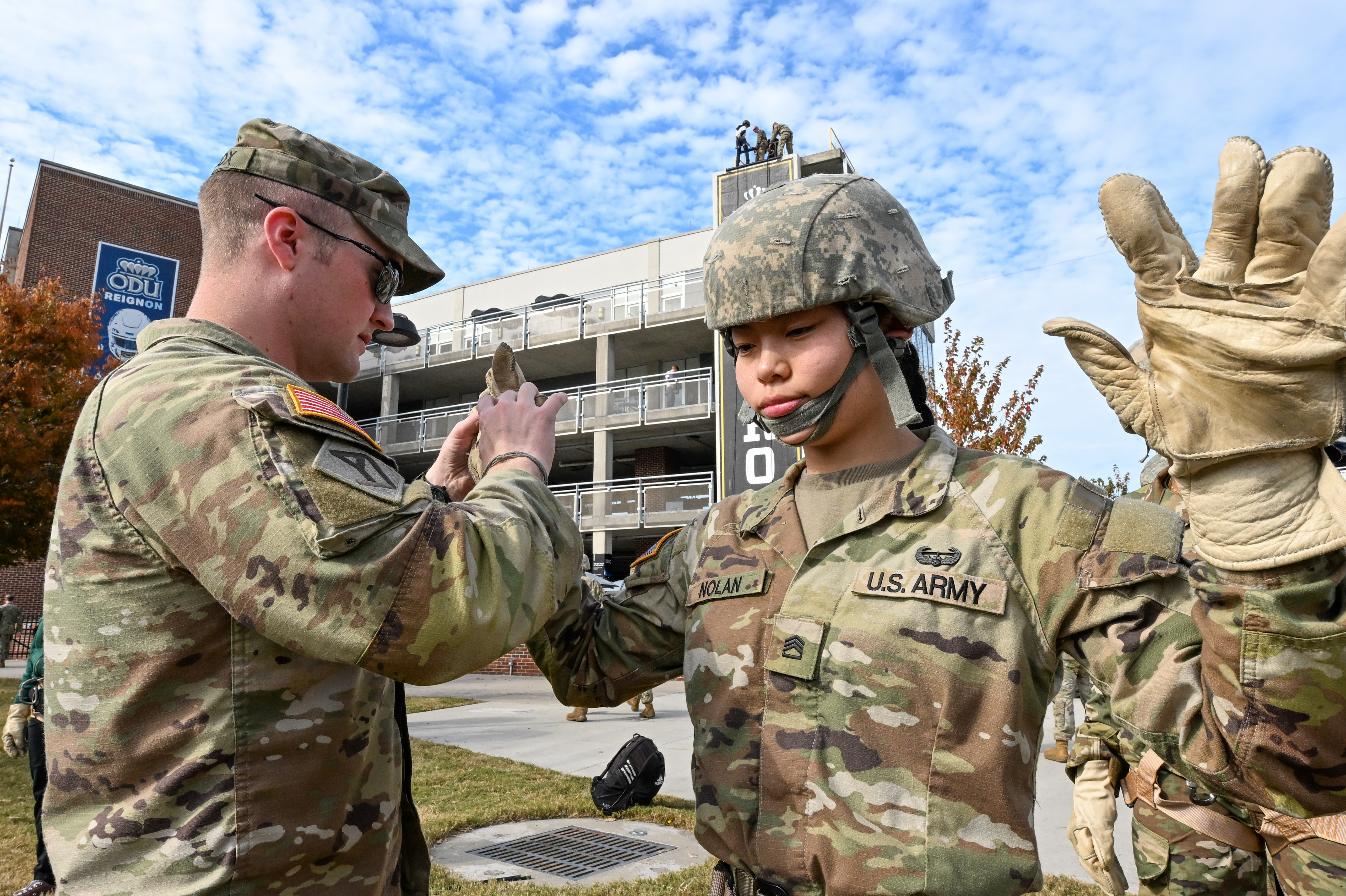 Sgt. 1st Class Michael Wilcox of the Lynchburg National Guard examines a cadet's gloves before they begin the exercise. Photo Chuck Thomas/ODU