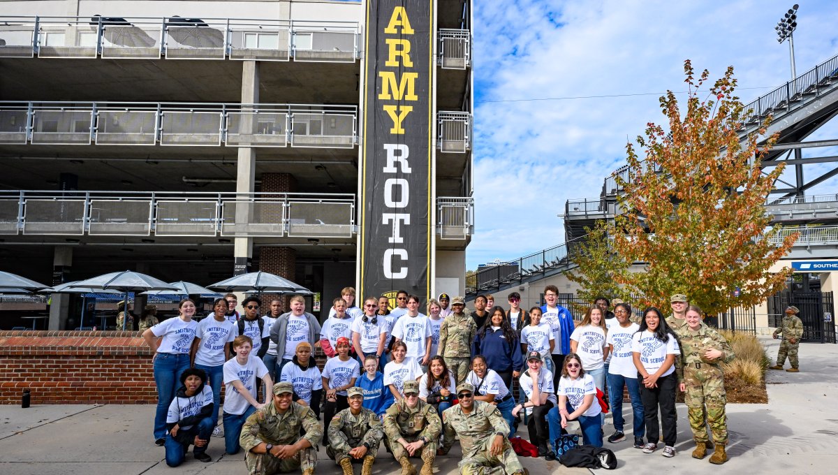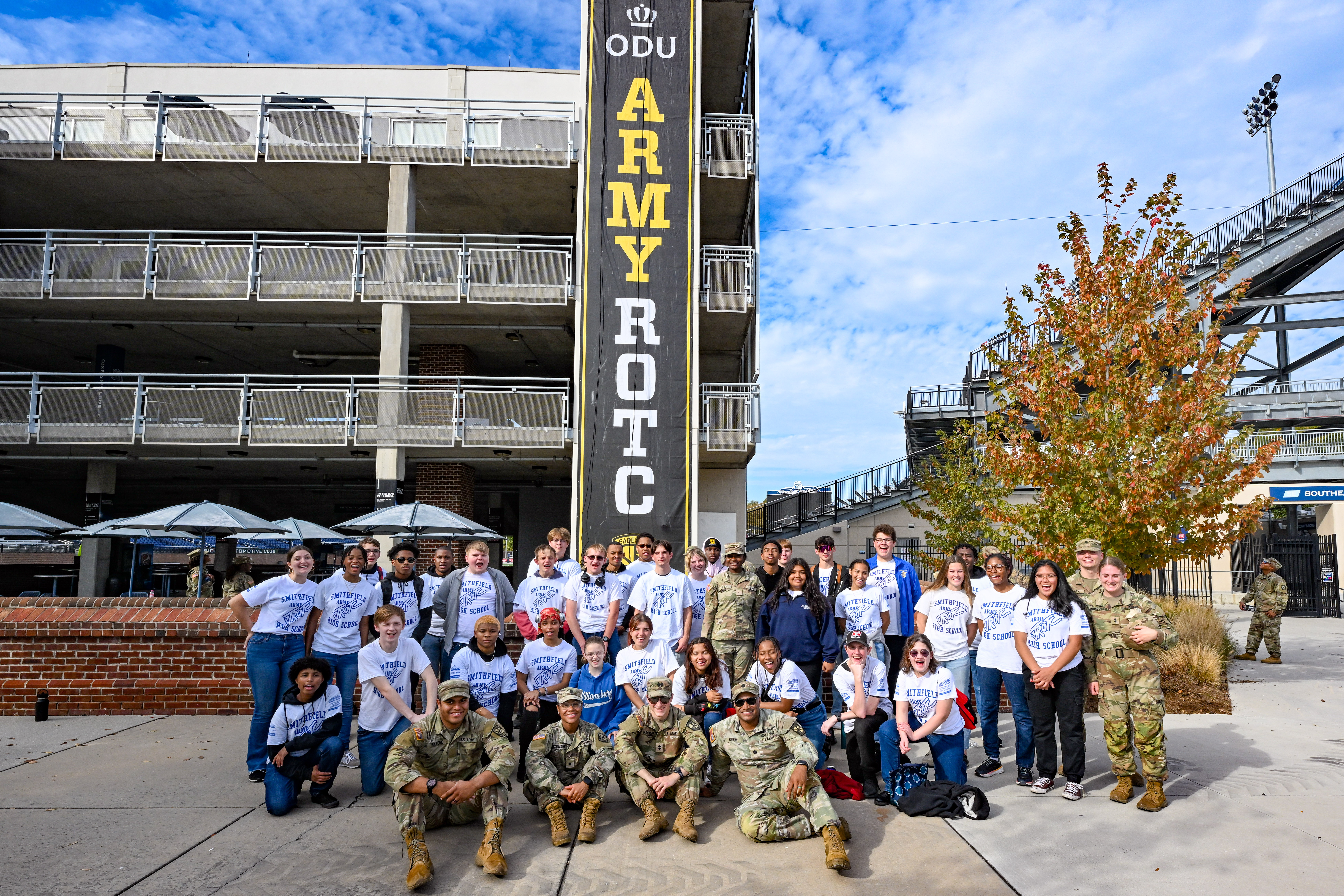 Smithfield High School students, ODU student cadets and members of the Army National Guard pose for a photo after the training. Photo Chuck Thomas/ODU