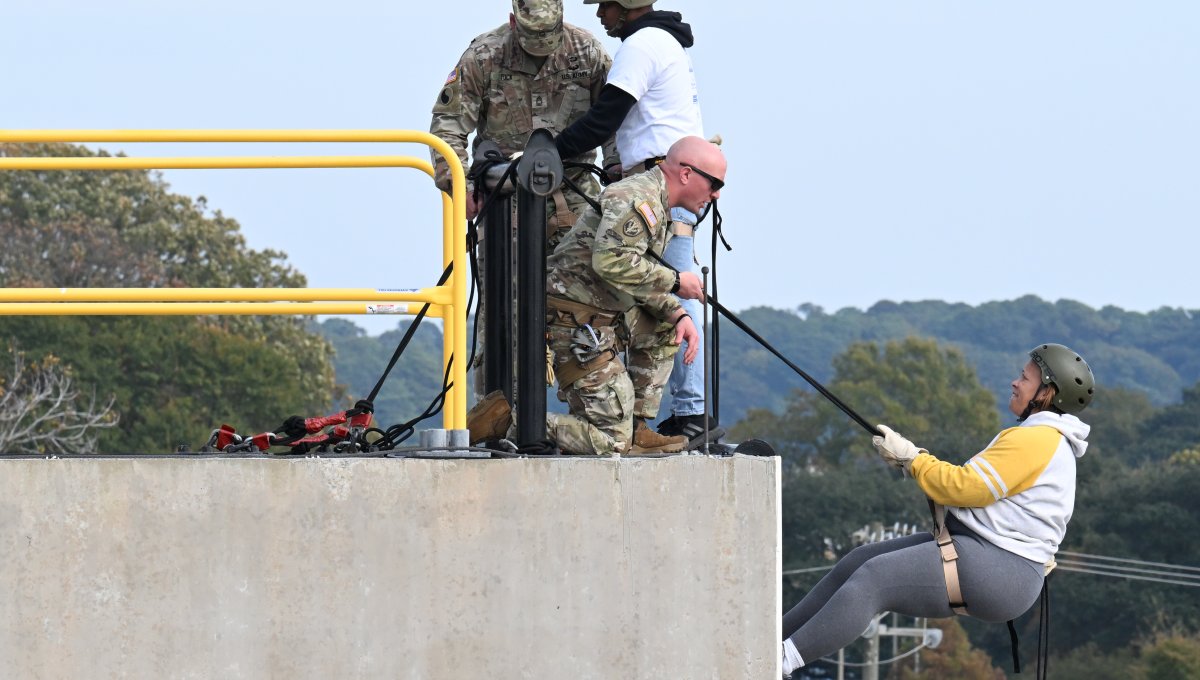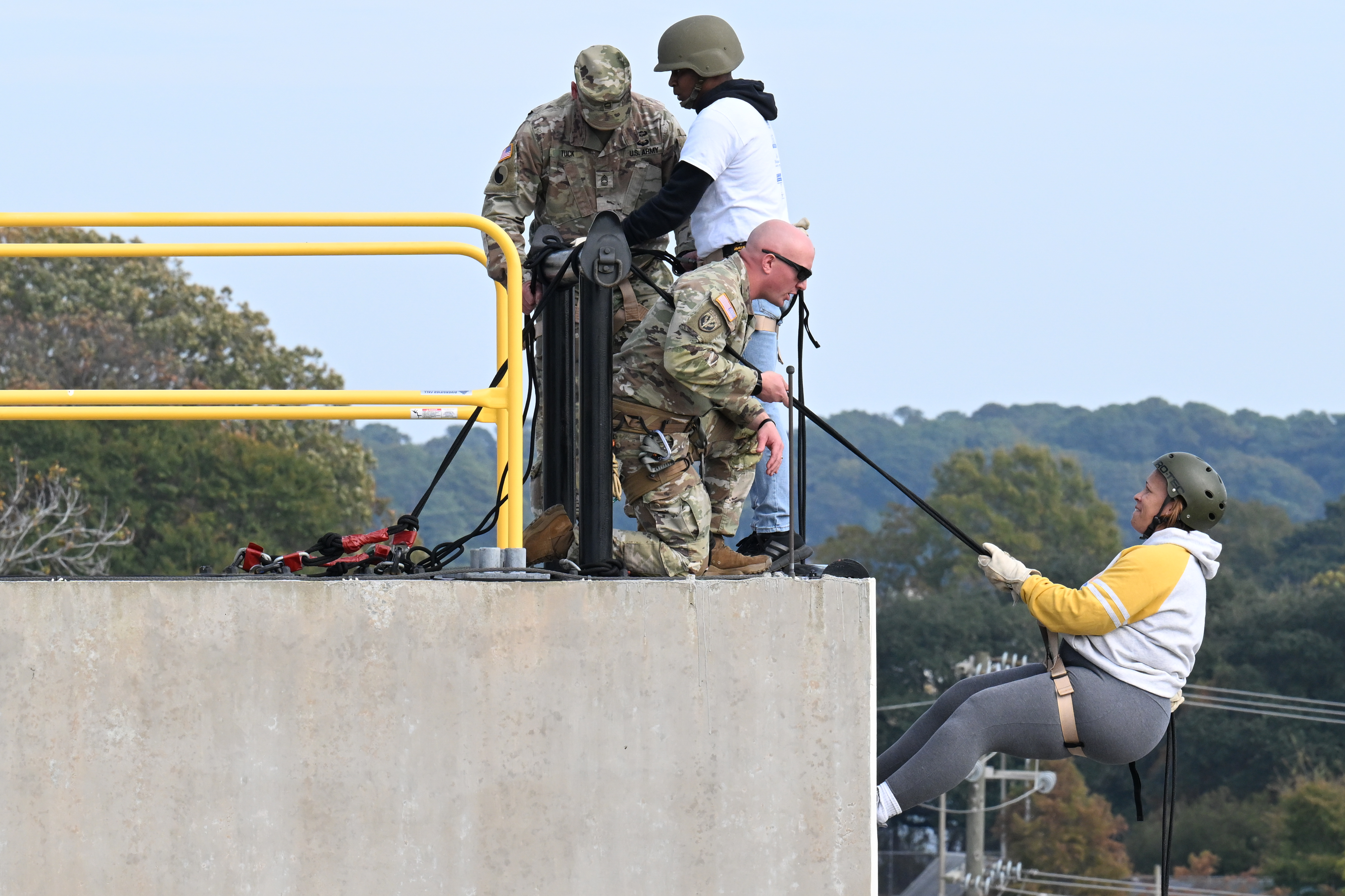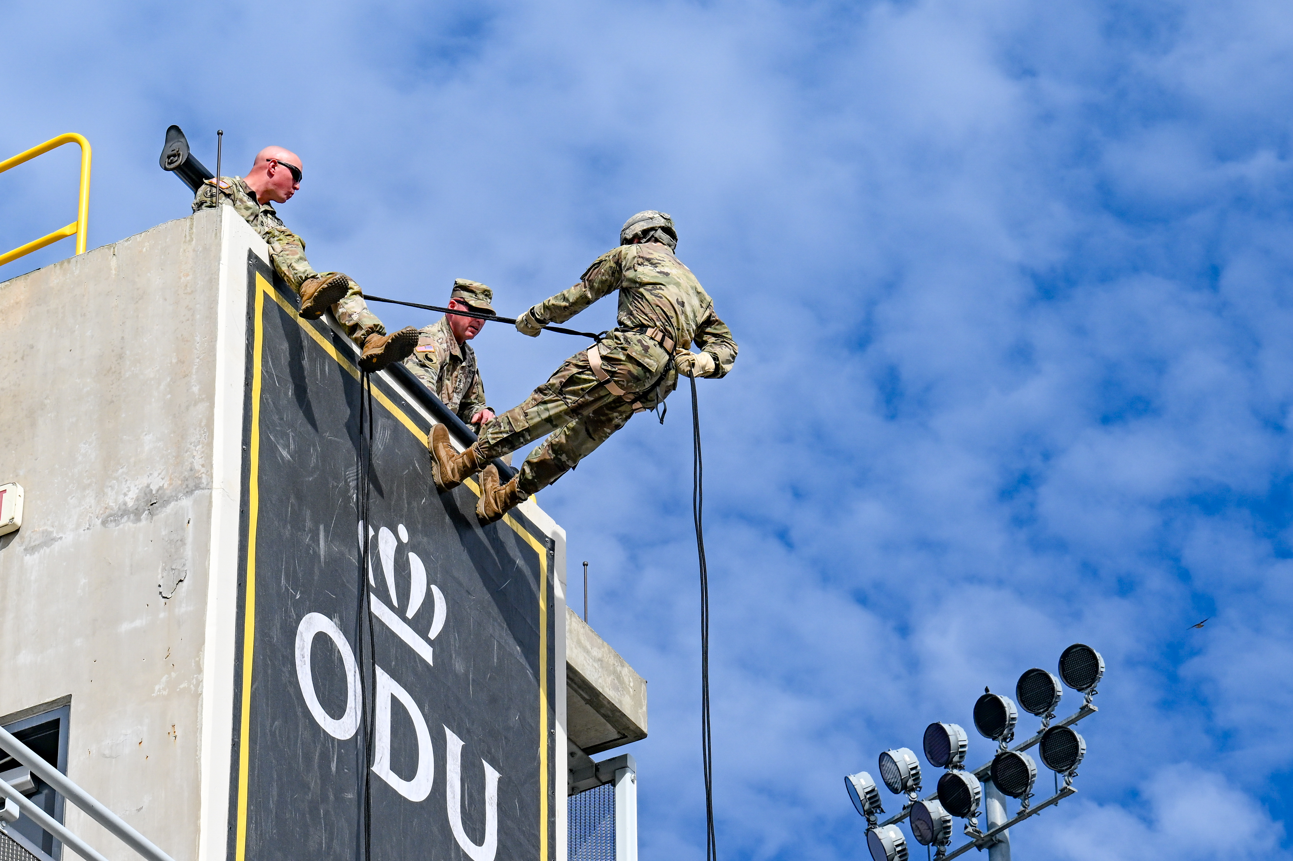 JROTC students and staff from Smithfield High School joined ODU AROTC students for rappel training at the Ainslie Game Day Building at S.B. Ballard Stadium. Rappel masters from the Virginia Army National Guard’s 183rd Regiment, Regional Training Institute, led the exercises. Photos by Chuck Thomas/ODU