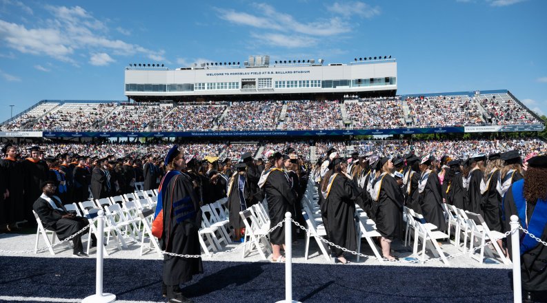 Nearly 2,000 undergraduate students from the College of Arts and Letters, the Strome College of Business, the Darden College of Education and Professional Studies, the Batten College of Engineering and Technology, the College of Health Sciences, the College of Sciences, the School of Cybersecurity and the School of Nursing received their degrees on a sunny morning at Kornblau Field at S.B. Ballard Stadium on May 6.