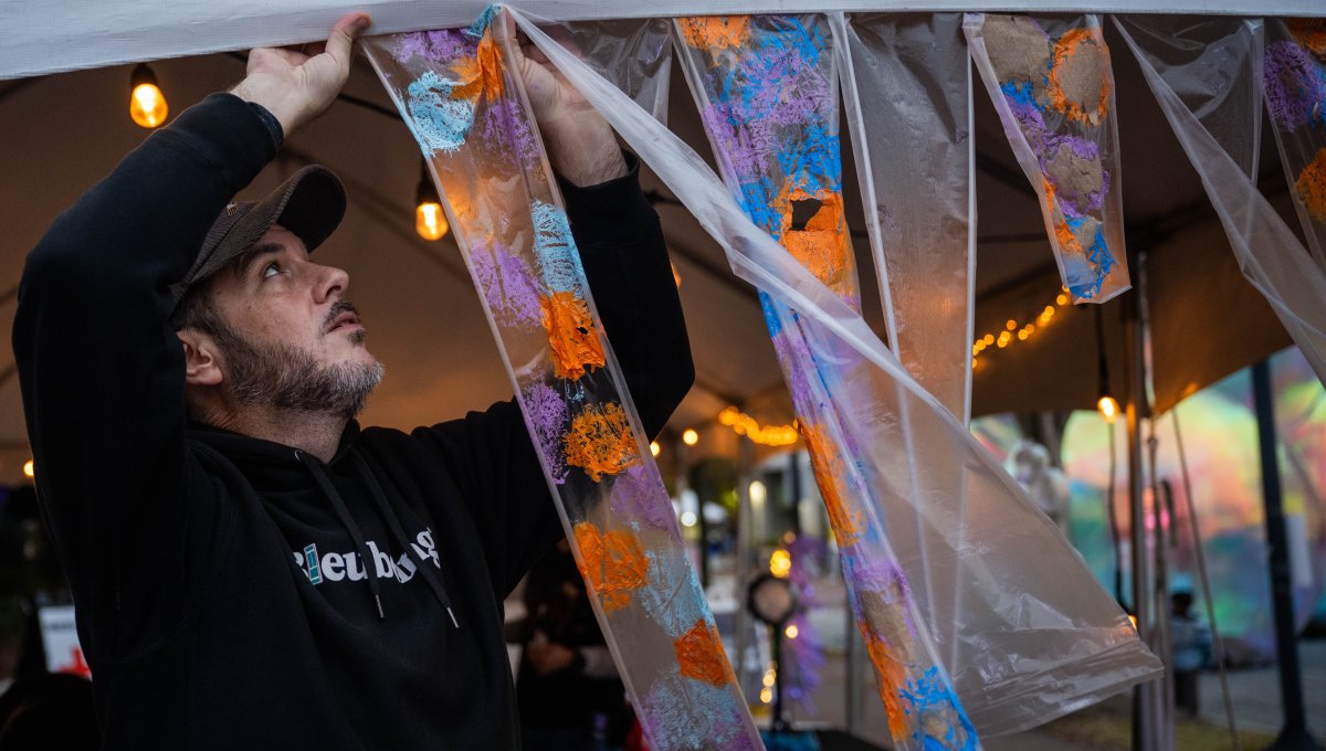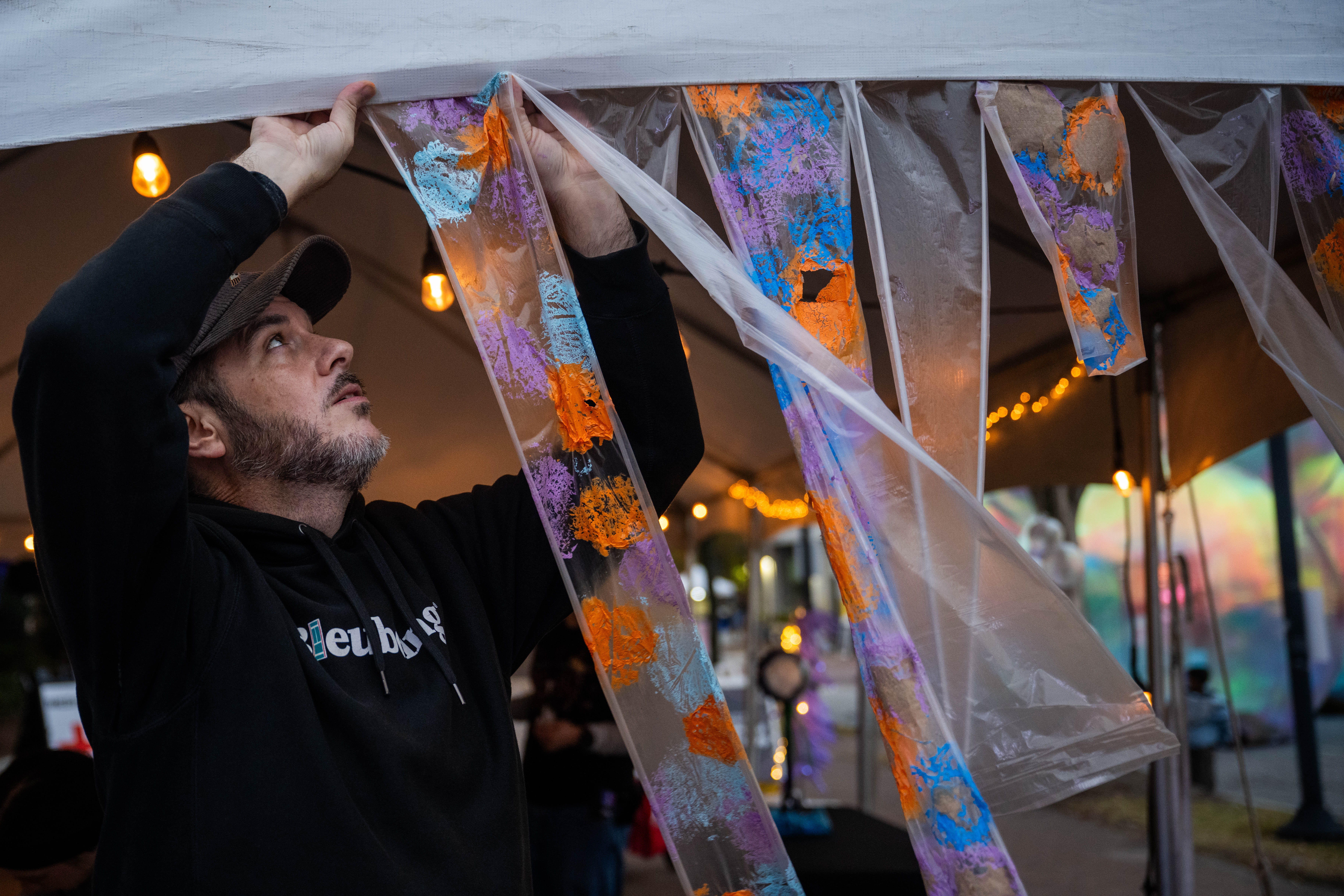 Local artist Rich Justis hangs “Ephemeral Art” before the start of this year’s Fifth Annual Public Arts Festival hosted by the Barry Art Museum. Photo Michael DiBari/ODU