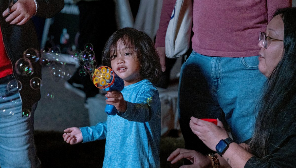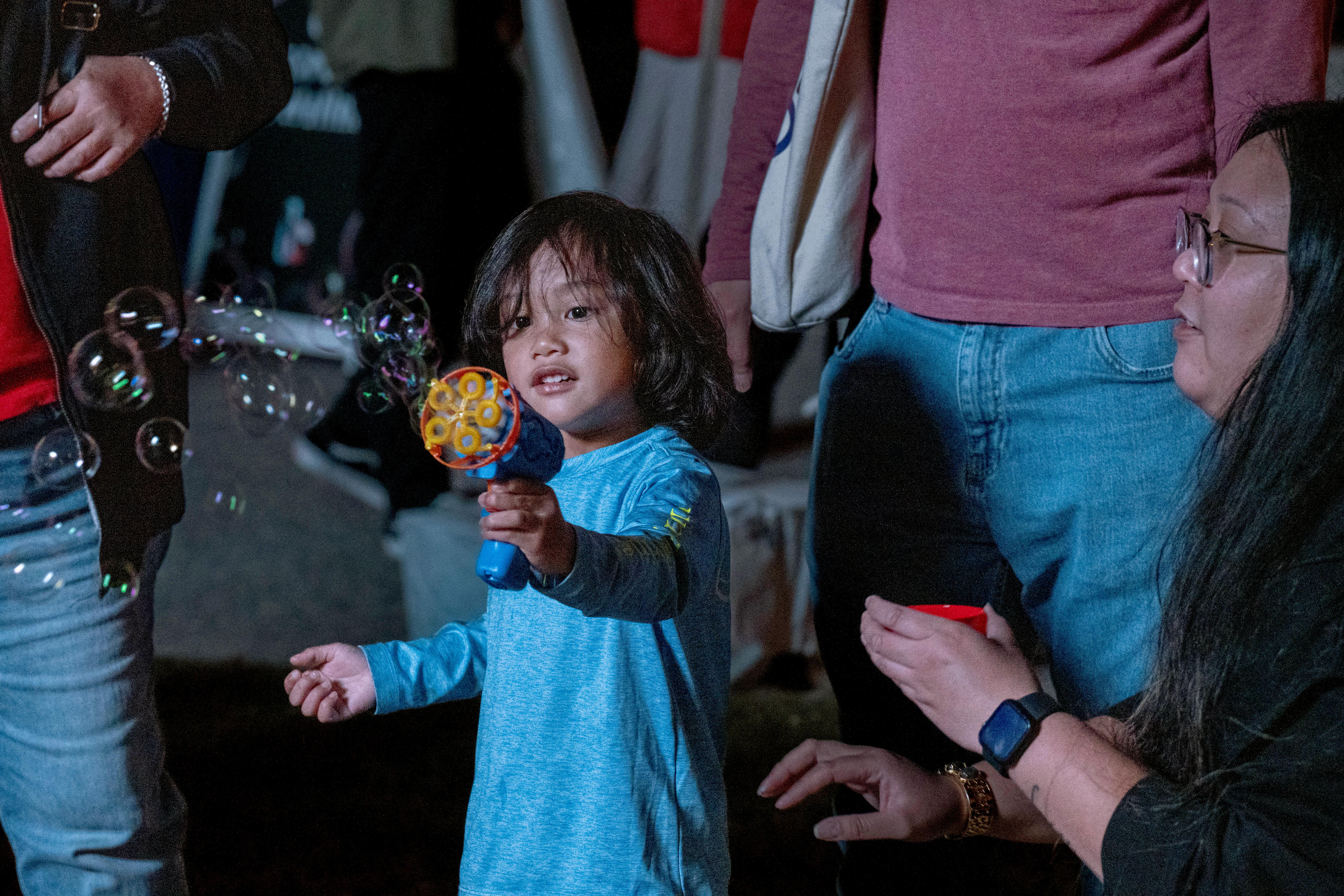 Sonney Canonigo, three, uses a bubble gun to blow bubbles as his aunt, Jordan Asban, and family watches. Photo Michael DiBari/ODU