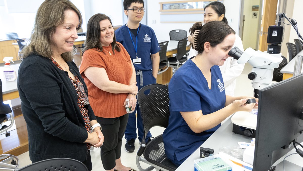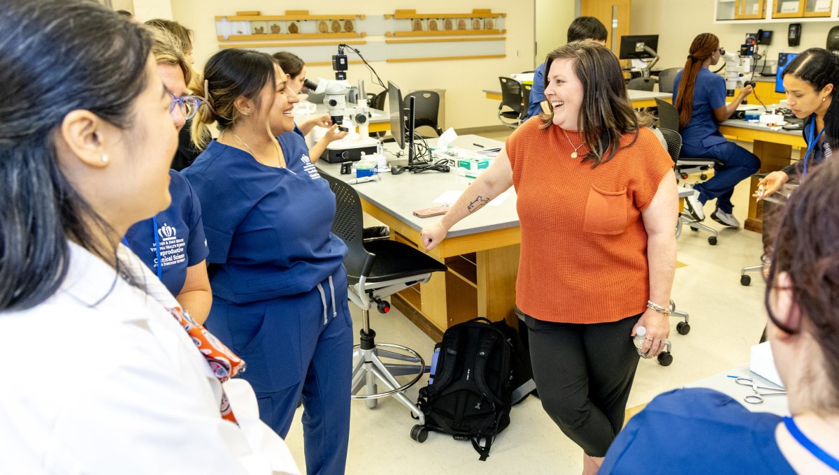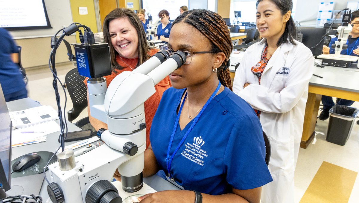 Elizabeth Carr, the first child born in America as a result of in vitro fertilization (IVF), returned to Macon & Joan Brock Virginia Health Sciences at Old Dominion University last week. Elizabeth met with students in the Reproductive Clinical Science – Embryology and Andrology program and program director Liang Yu, Ph.D. The program carries on the school’s pioneering legacy in reproductive medicine by teaching assisted-reproductive techniques to M.S. and Ph.D. students from around the world. During her visit, Carr also received an award from Dean C. Donald Combs, Ph.D. in recognition of her work as an ambassador for IVF and reproductive clinical science education.