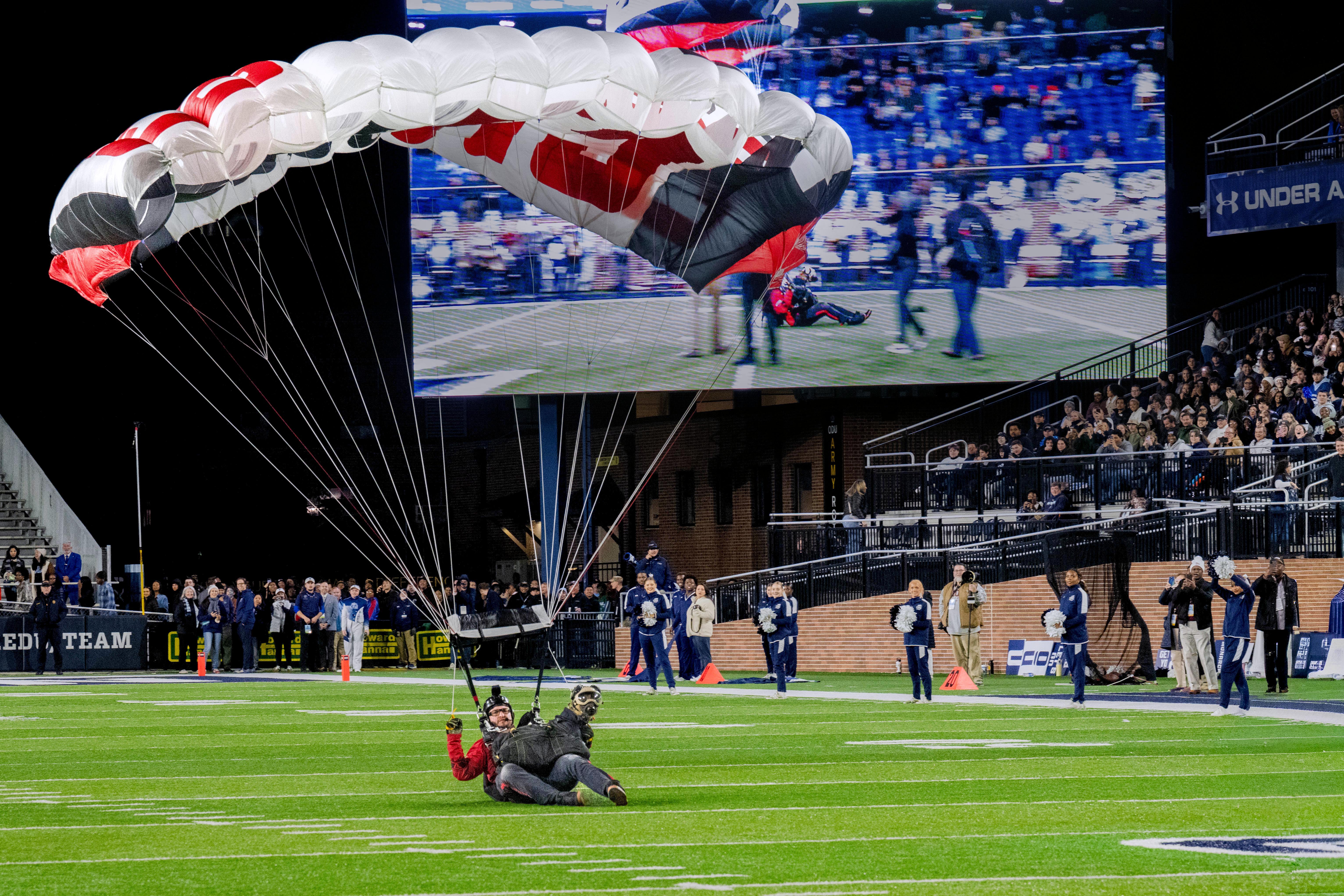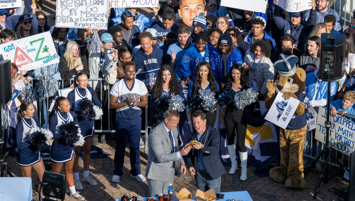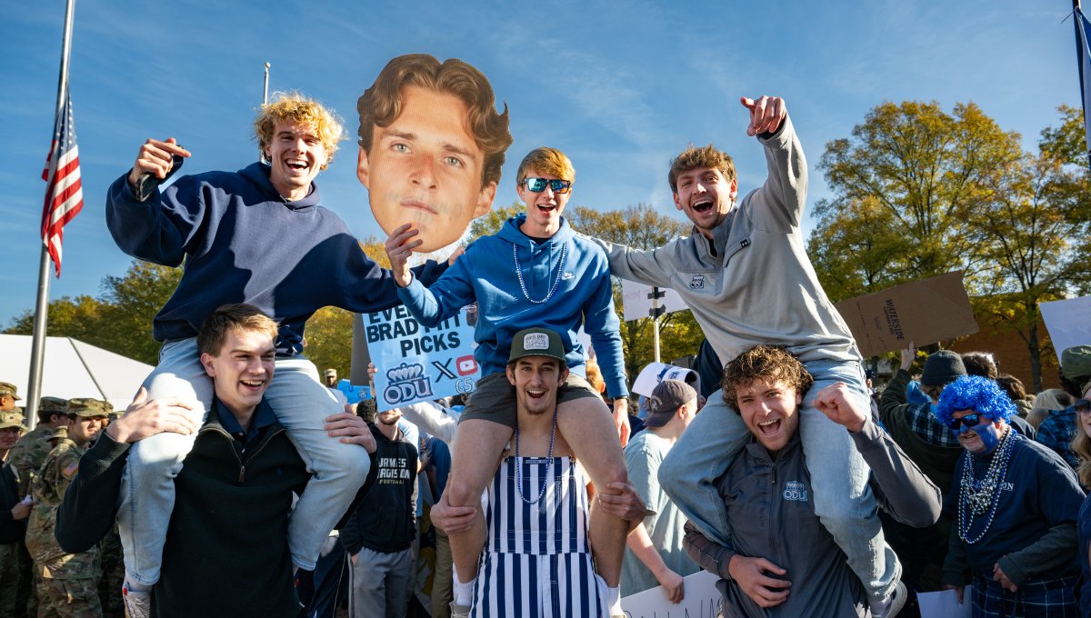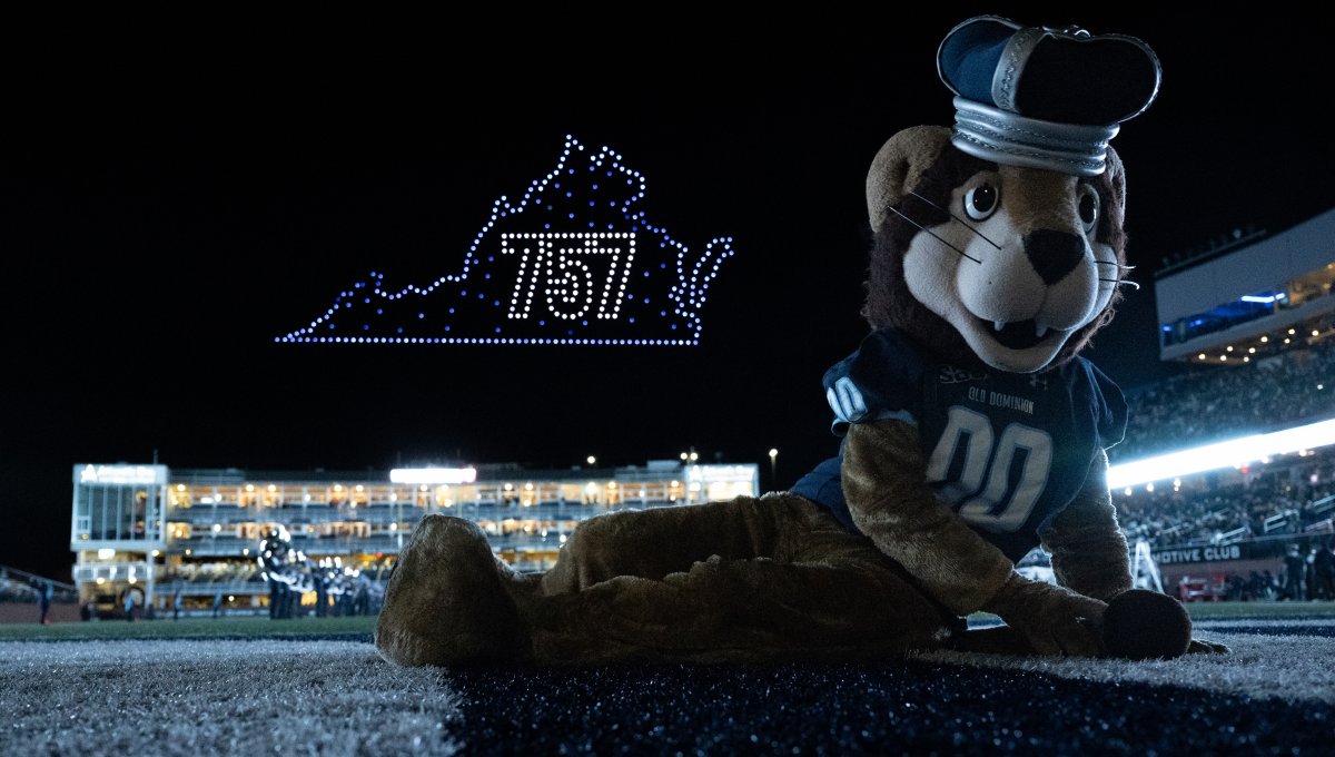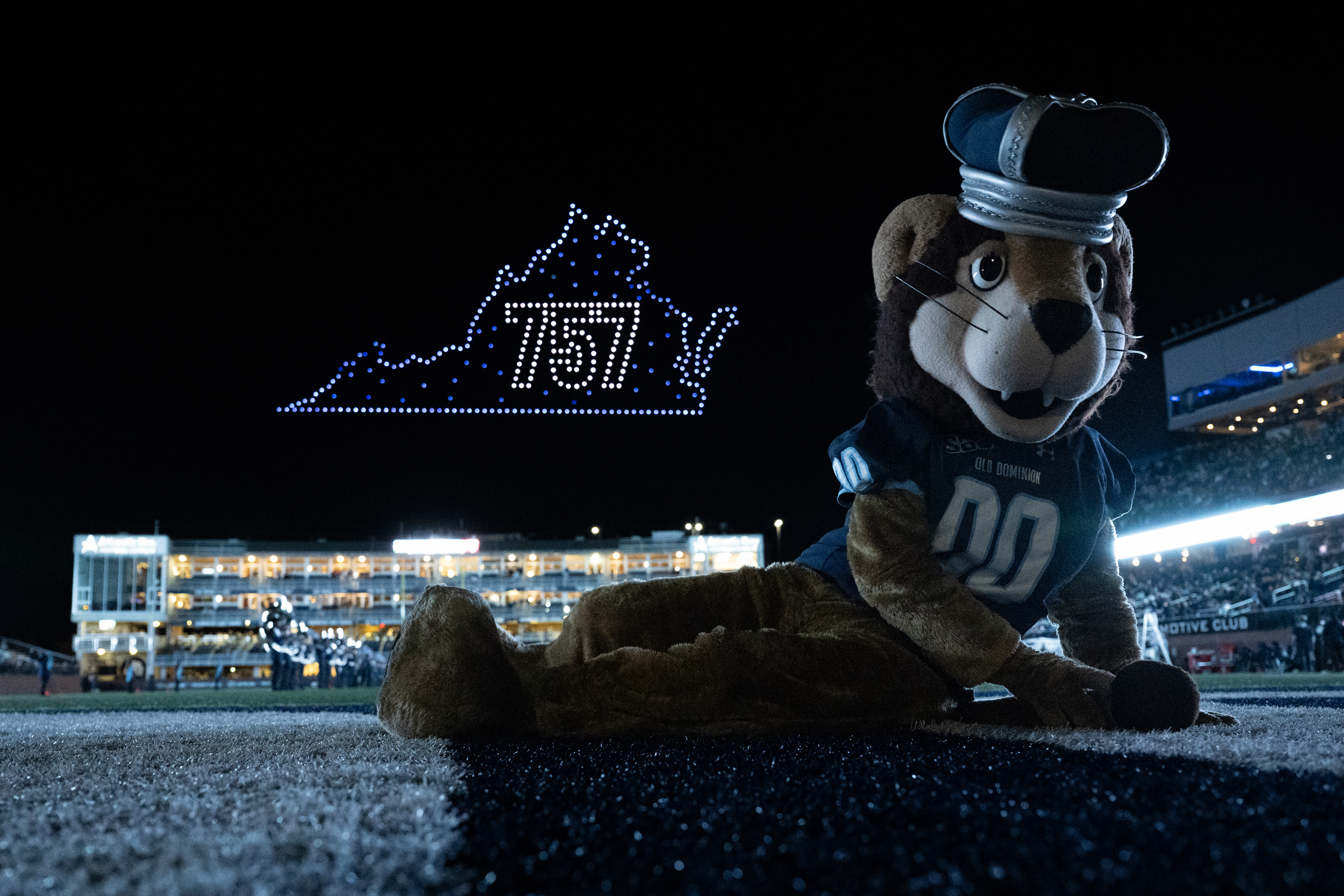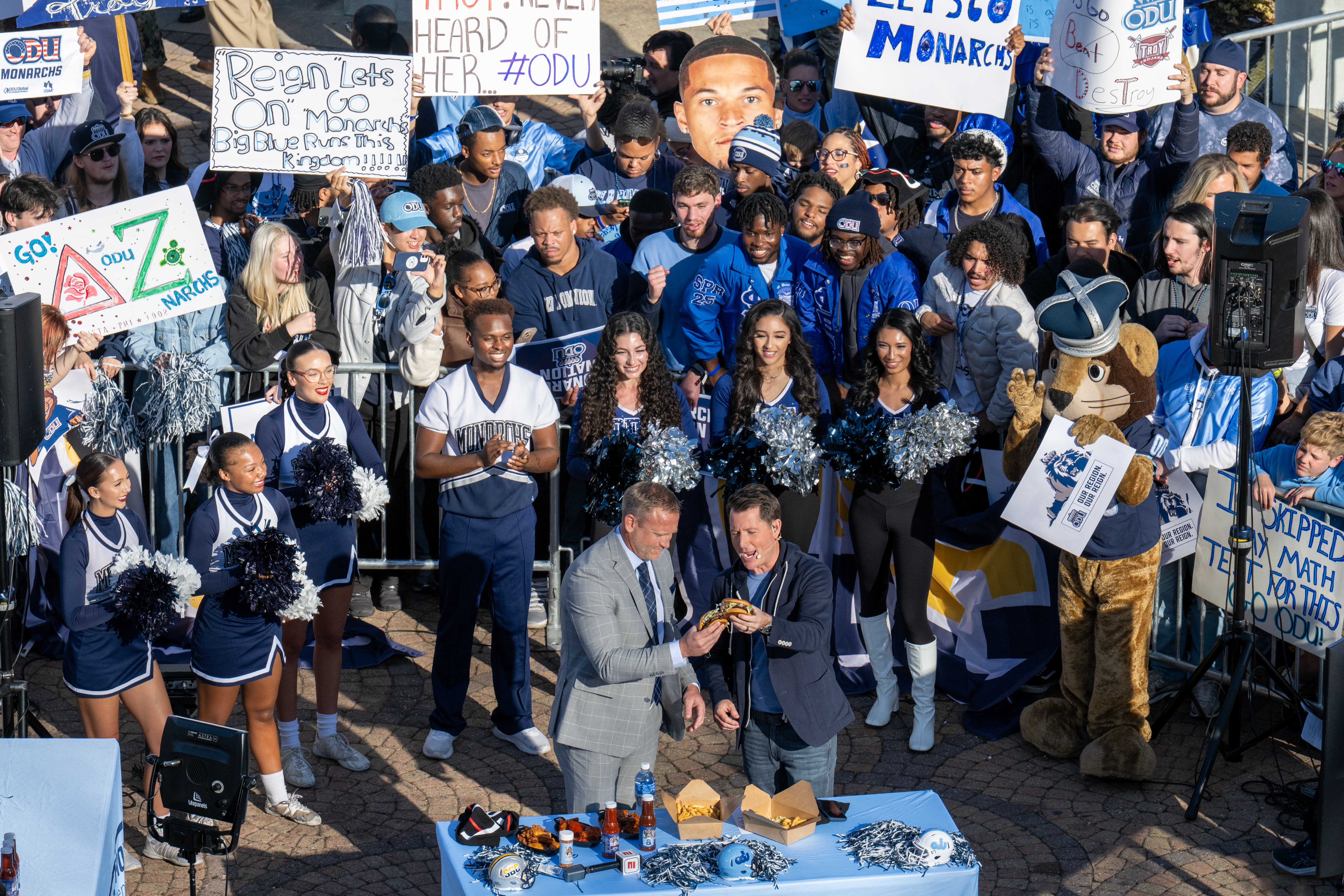 Millions tuned in to watch Old Dominion University football on November 13 during a prime time, nationally televised game against Troy. The day began with a cake-eating contest, raffle giveaways and a live DJ, leading into ESPN SportsCenter Live on Kaufman Mall, where fans celebrated their school spirit. Gameday highlights included a parachute jump and a halftime drone show in honor of Military Appreciation Week. Photos Chuck Thomas and Michael Dibari/ODU
