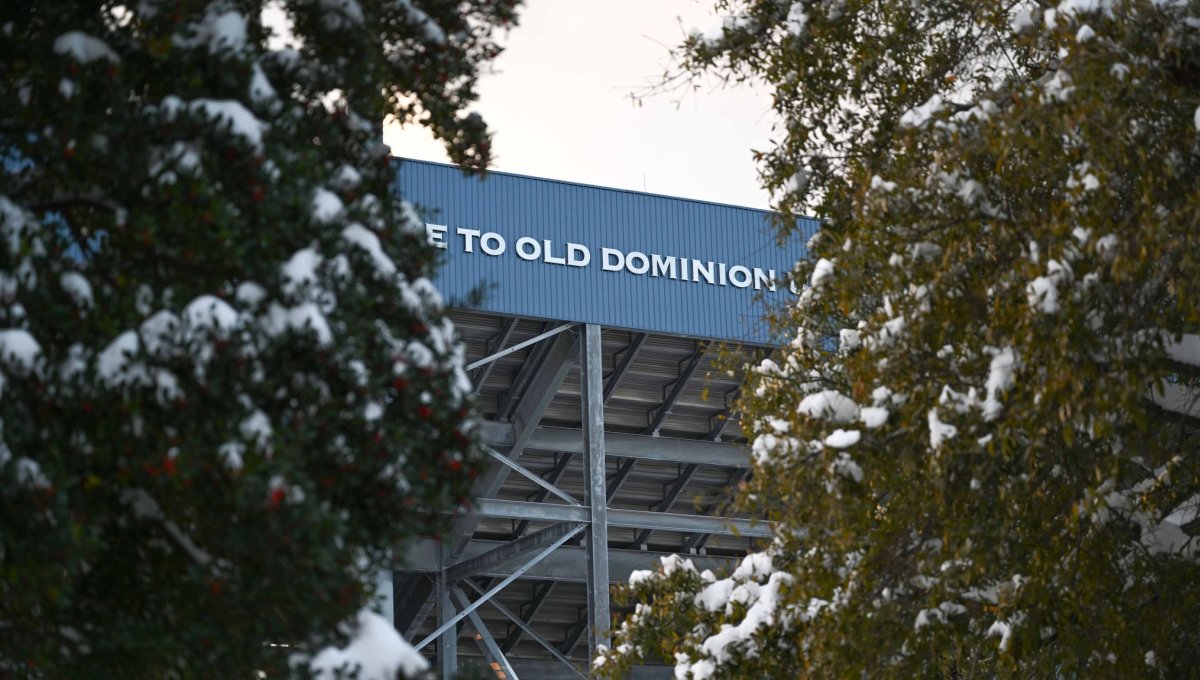 A winter storm hits Coastal Virginia Feb. 21-23, dropping nearly a foot of snow in an area unaccustomed to it. Snow hanging in the trees in front of S.B. Ballard Stadium teased what fell on the rest of campus. Photo Morganne Lander/ODU