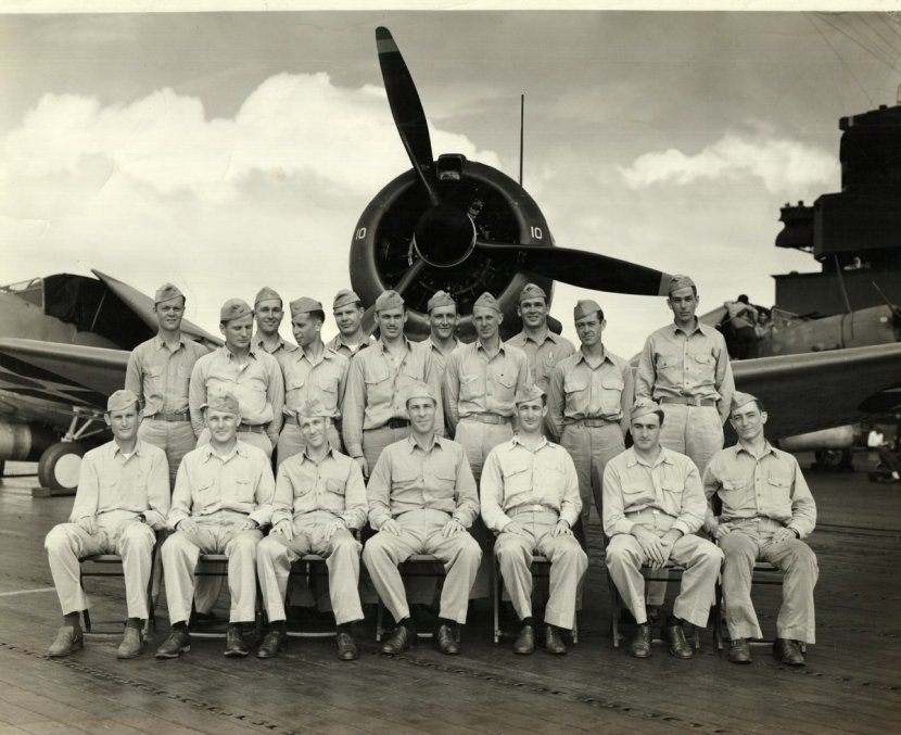 Dusty's squadron. This image was taken on the flight deck of USS Enterprise on January 24, 1942. It depicts the pilots of Scouting Squadron Six. Dusty is in the front row, at the far right.