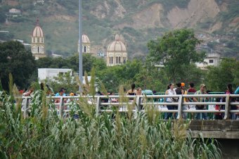 Simón Bolívar International Bridge is the pedestrian Border Crossing between Colombia and Venezuela. Photo taken from the municipality of Villa del Rosario (Corregimiento La Parada), Norte de Santander, Colombia Basílica Menor de San Antonio de Padua [background], city of San Antonio del Táchira, Táchira, Venezuela.