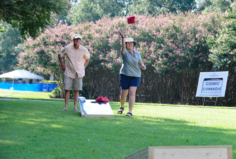 Liz Smith and Professor Fred Dobbs play "cosmic cornhole" for Ocean, Earth & Atmospheric Sciences departmental bragging rights. Photo Chuck Thomas/ODU