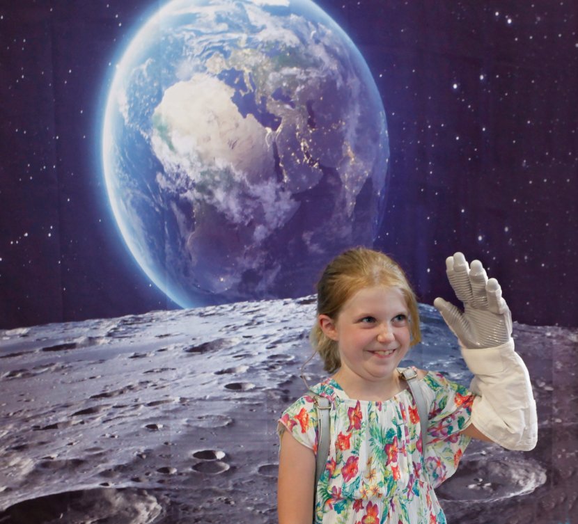 Elizabeth Tillson, 8, dons an astronaut glove and waves to her family at the selfie booth. Photo David B. Hollingsworth/ODU