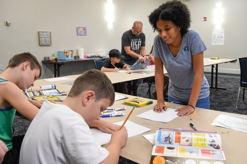 Art education student Kristin Lee is all smiles as Jaxon Hipp works on his space monoprint. Photo Chuck Thomas/ODU
