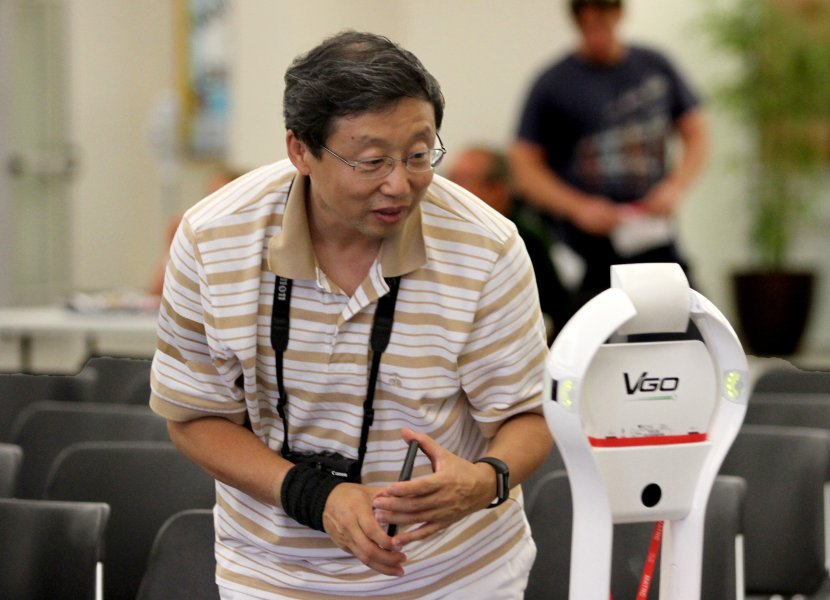 NASA employee Ji Su meets the robot, Vgo, at the moon landing celebration. Photo David B. Hollingsworth/ODU