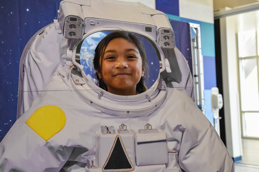 Savannah Viar enjoys the astronaut selfie station. Photo Chuck Thomas/ODU