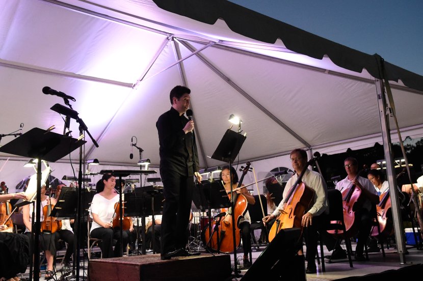 Virginia Symphony Orchestra conductor Gonzalo Farias thanks the audience for waiting in the heat. Photo Chuck Thomas/ODU