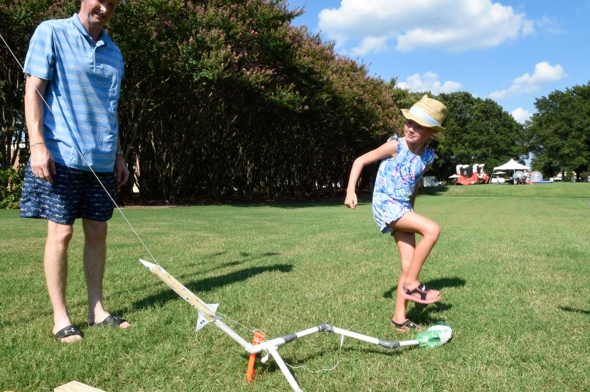 Molly Donohue prepares to launch her rocket as her dad, Kieran, watches. Photo Chuck Thomas/ODU