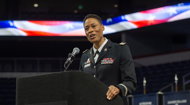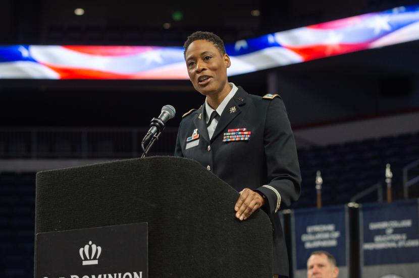 Lt. Col. Camala L. Coats, professor of military science, delivers remarks during the Spring Commissioning Ceremony on May 5 at Chartway Arena. Photo Chuck Thomas/ODU