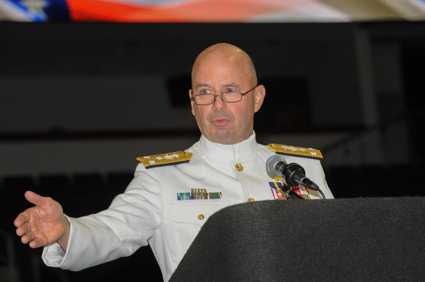Vice Adm. James Kilby, deputy commander of the U.S. Fleet Forces Command, delivers remarks during the Spring Commissioning Ceremony on May 5 at Chartway Arena. Photo Chuck Thomas/ODU