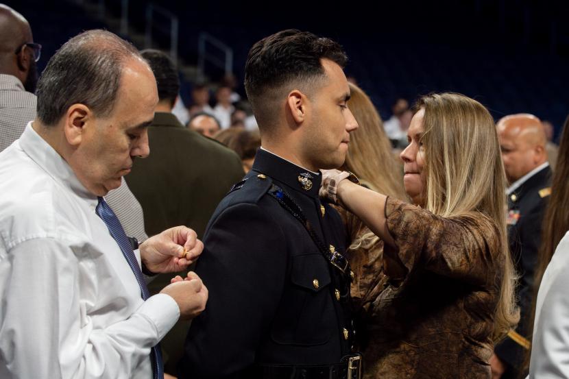 Richard Garza receives his pins of rank from family members during the Spring Commissioning Ceremony on May 5 at Chartway Arena. Photo Chuck Thomas/ODU