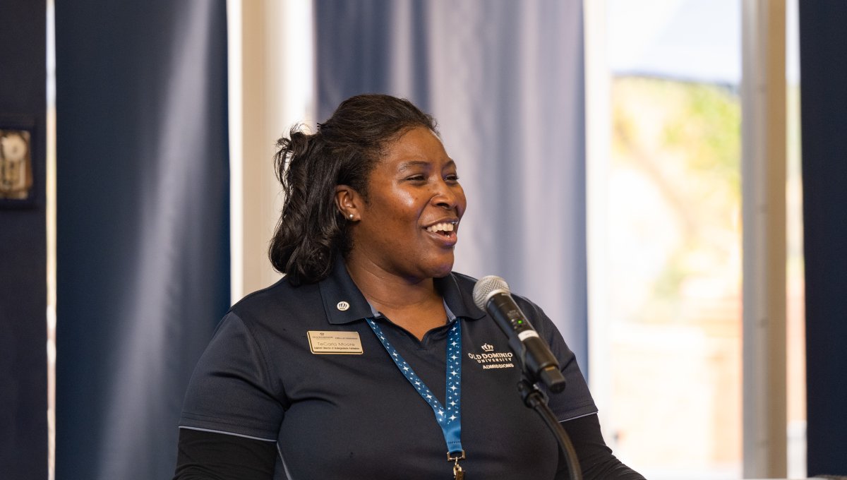 Assistant Director of Undergraduate Admissions Tecarla Moore welcomes students and their families. Photo Nicholas Clark/ODU