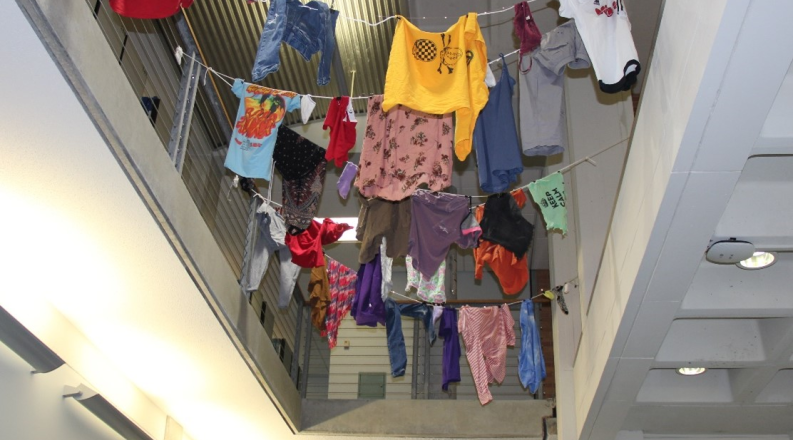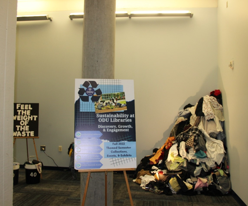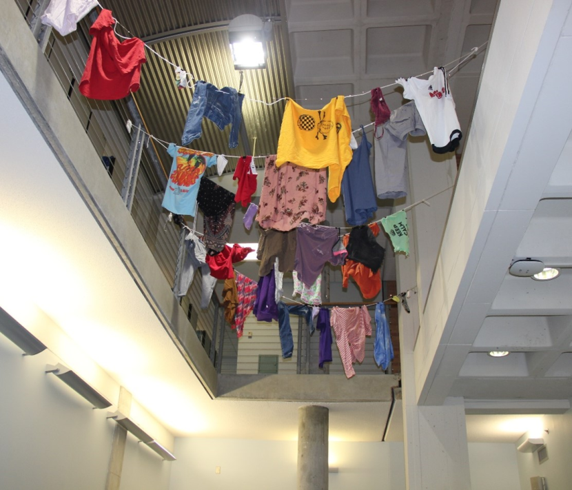If you find yourself wandering into the Perry Library Gallery, try something: Look up. Don't worry, no one's doing their laundry. Those clothes you see hanging from the ceiling are part of an exhibition put on by fashion merchandising students in SEPS 495, Sustainability in the Fashion Industry. The class is taught by Professor Joy Kelly, who, along with her students, hopes to bring attention to the impact of consumer textile waste. They also want to inform consumers about what can be done to lessen it.