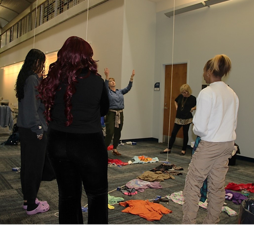 As a group, the students developed a display sketch that would capture attention, educate and engage visitors, and provide information on how to keep unwanted textiles out of landfills. After fleshing out the idea and conducting research, they selected elements to prepare based on their strengths and abilities. The biggest tasks were to design signage and gather textile donations: unwanted garments, holey and unmated socks, clothing items unsuitable to donate, household textiles, and fabric bits.