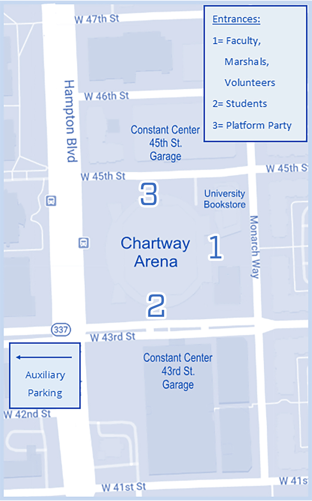 Commencement exercises will be held at Chartway Arena in the Ted Constant Convocation Center. To limit exposure to inclement weather, graduation candidates will now check in, line up and robe in the Big Blue Room at the Constant Center instead of Webb University Center. Faculty members will robe in the Chartway Arena's east lobby, off Monarch Way.