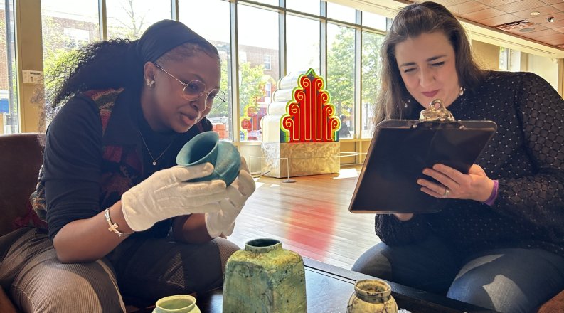Top photo: Gordon Art Galleries Graduate Assistants Gabrielle Dempsey, left, and Nicole Honeycutt assess the condition of one of Mike “Termite” Hires’ ceramic pieces prior to accession. Photo by Jasper Waugh-Quasebarth/ODU